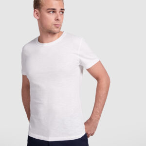 Camiseta de manga corta entallada en cintura. Algodón peinado. Escote entretelado en V. Ribete en mangas del mismo tejido al tono. Cubrecosturas en cuello del mismo tejido.