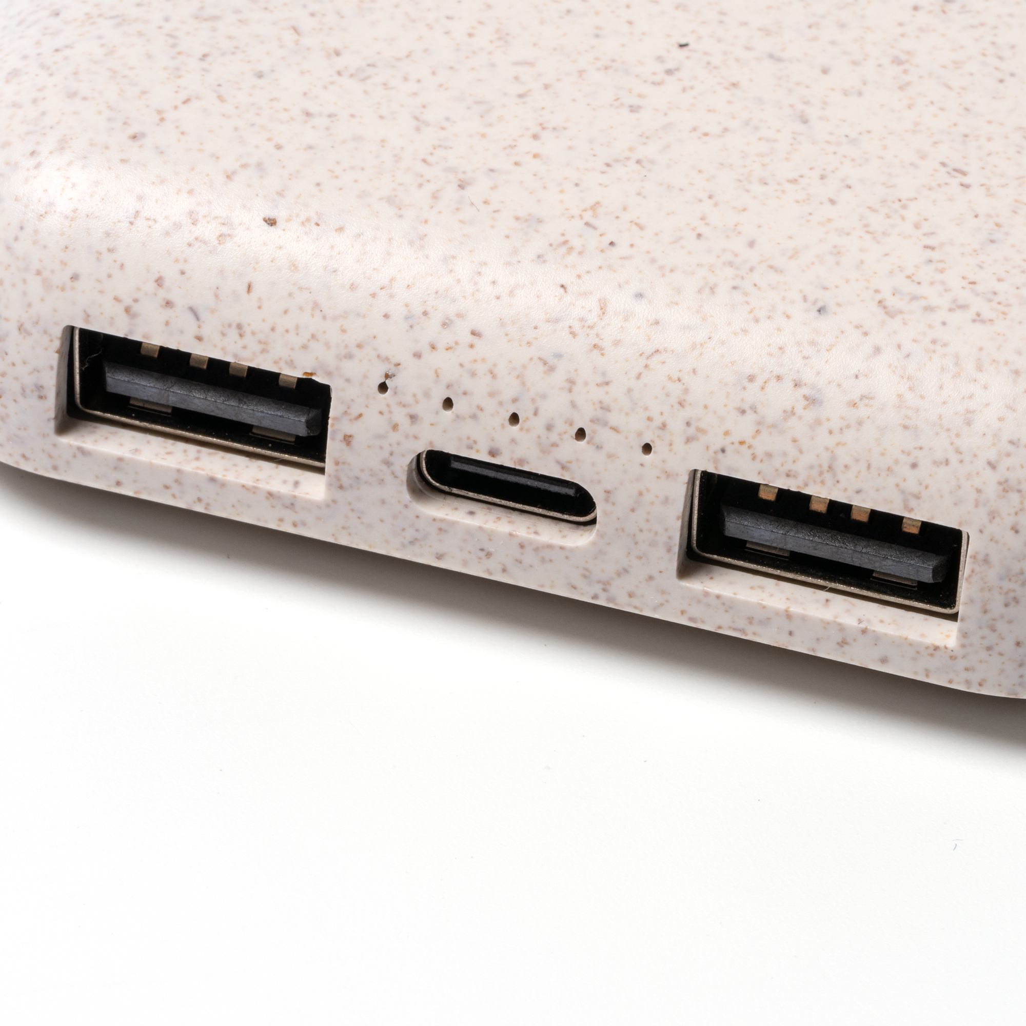 Batería externa de 10000 mAh con cuerpo elaborado en bambú y fibra de trigo. Cuenta con cargador inalámbrico en la superficie compatible con dispositivos que admiten esta tecnología. Con indicadores luminosos de carga. Con entrada y salida de corriente Tipo C y USB, permite cargar varios dispositivos simultáneamente.