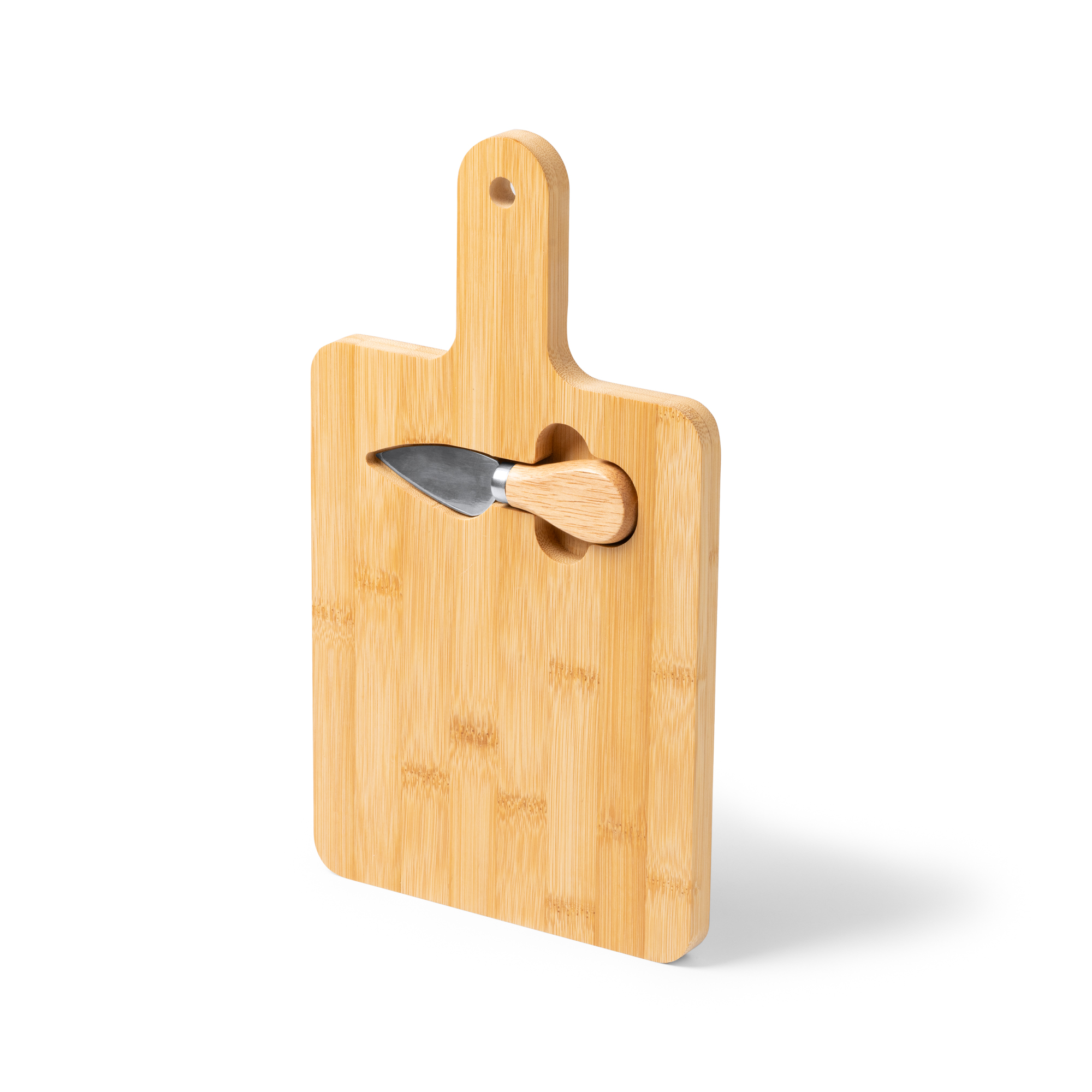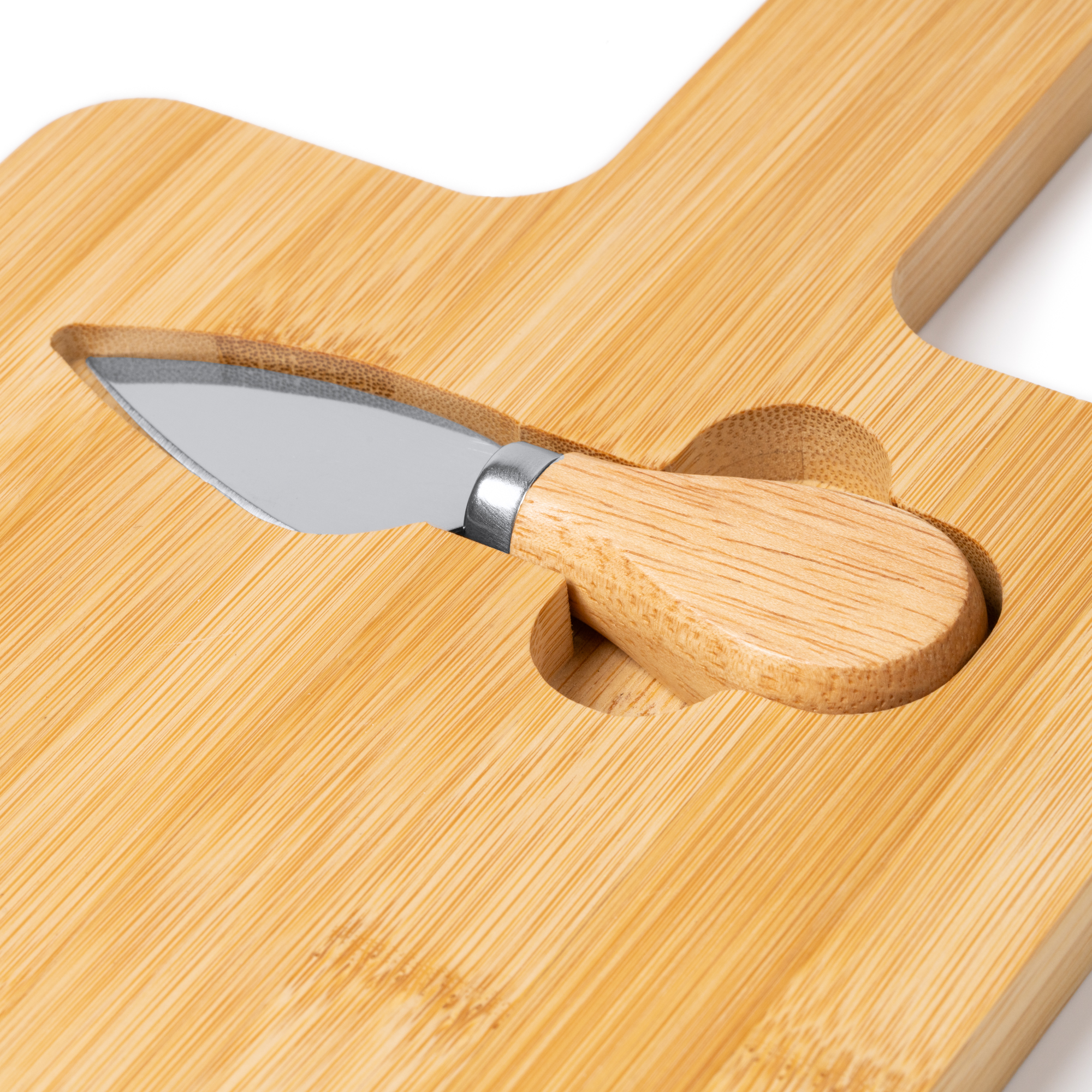 Tabla de cortar de bambú, incorpora un mango para un manejo cómodo. Incluye un cuchillo de acero inoxidable especial para quesos, ideal para preparar y servir con elegancia.