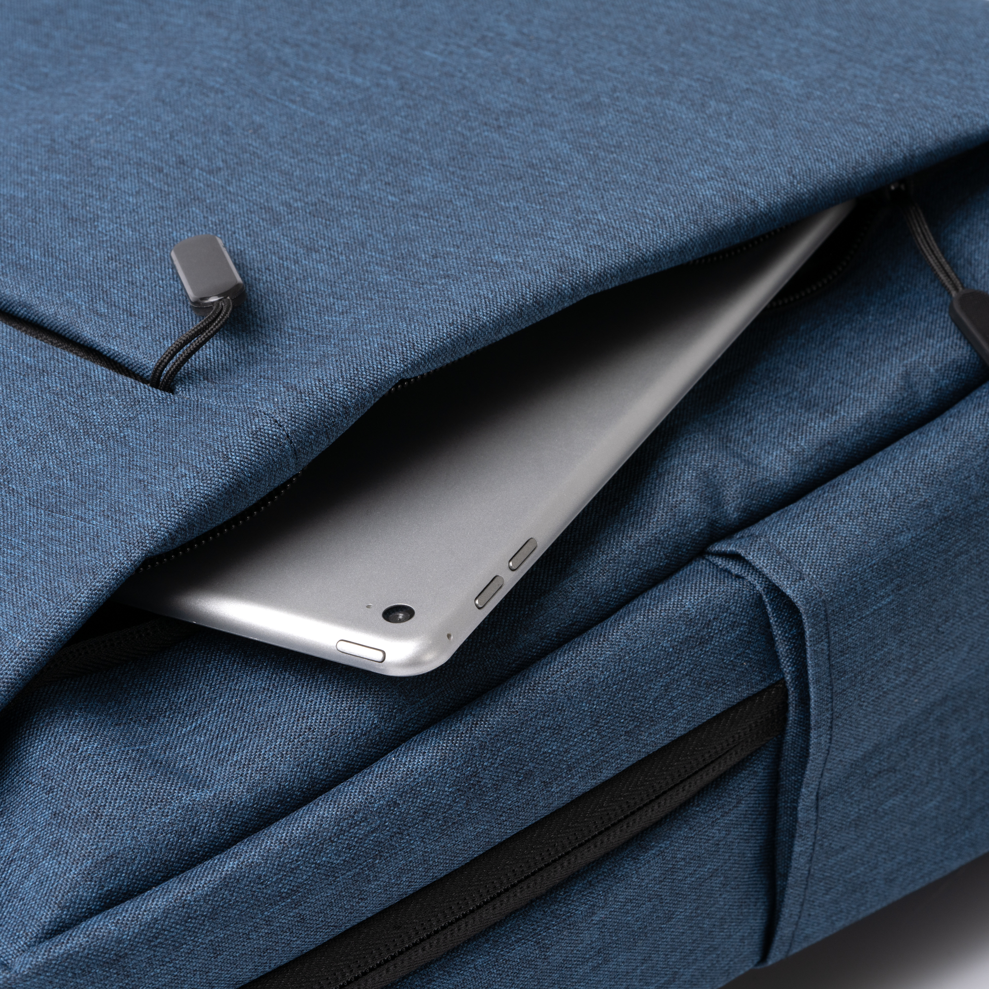 Mochila realizada en 600D RPET con acabado jaspeado. Gran compartimento interior con bolsillo para portátil de 15″. Bolsillo exterior con cierre de cremallera y bolsillo lateral. Asas acolchadas. Cinta para trolley.