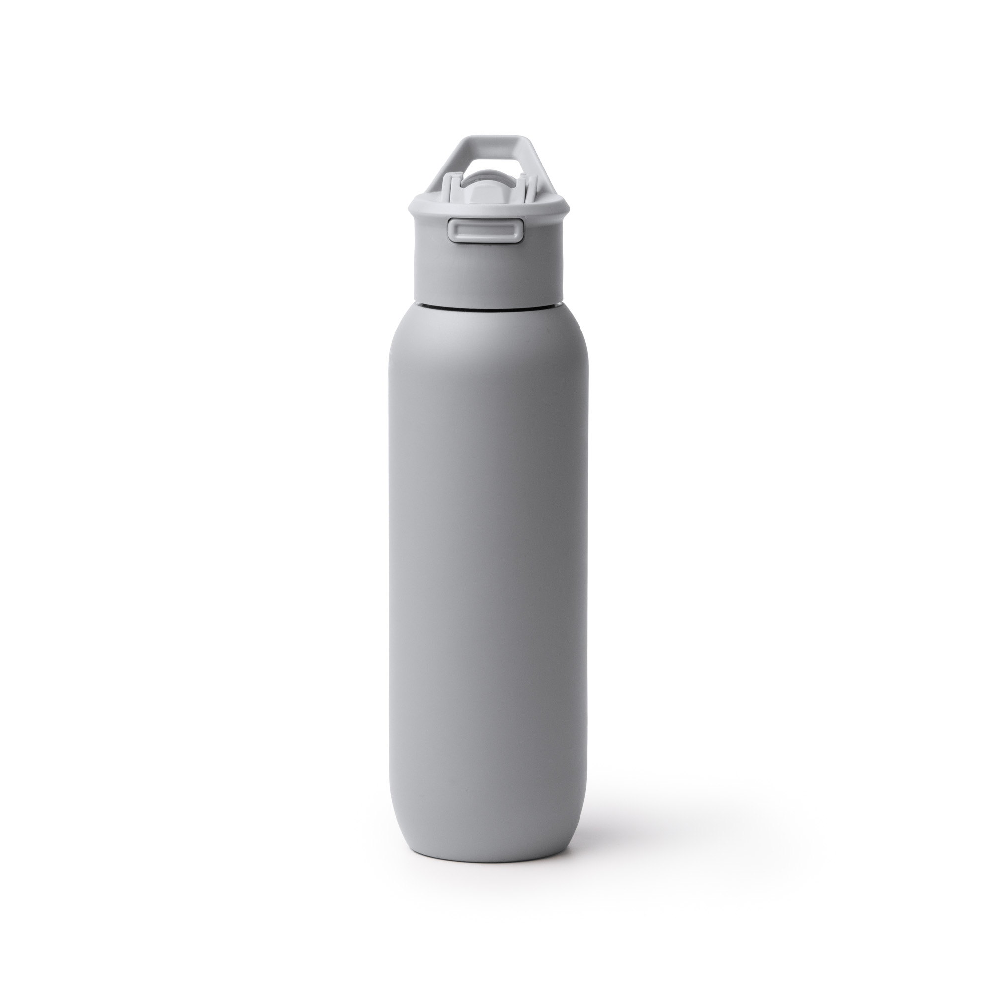 Bidón térmico de acero inoxidable 304 reciclado de doble pared. Capacidad de 500ml. Cierre automático con pajita de silicona y asa de transporte. Presentación en caja diseño eco.