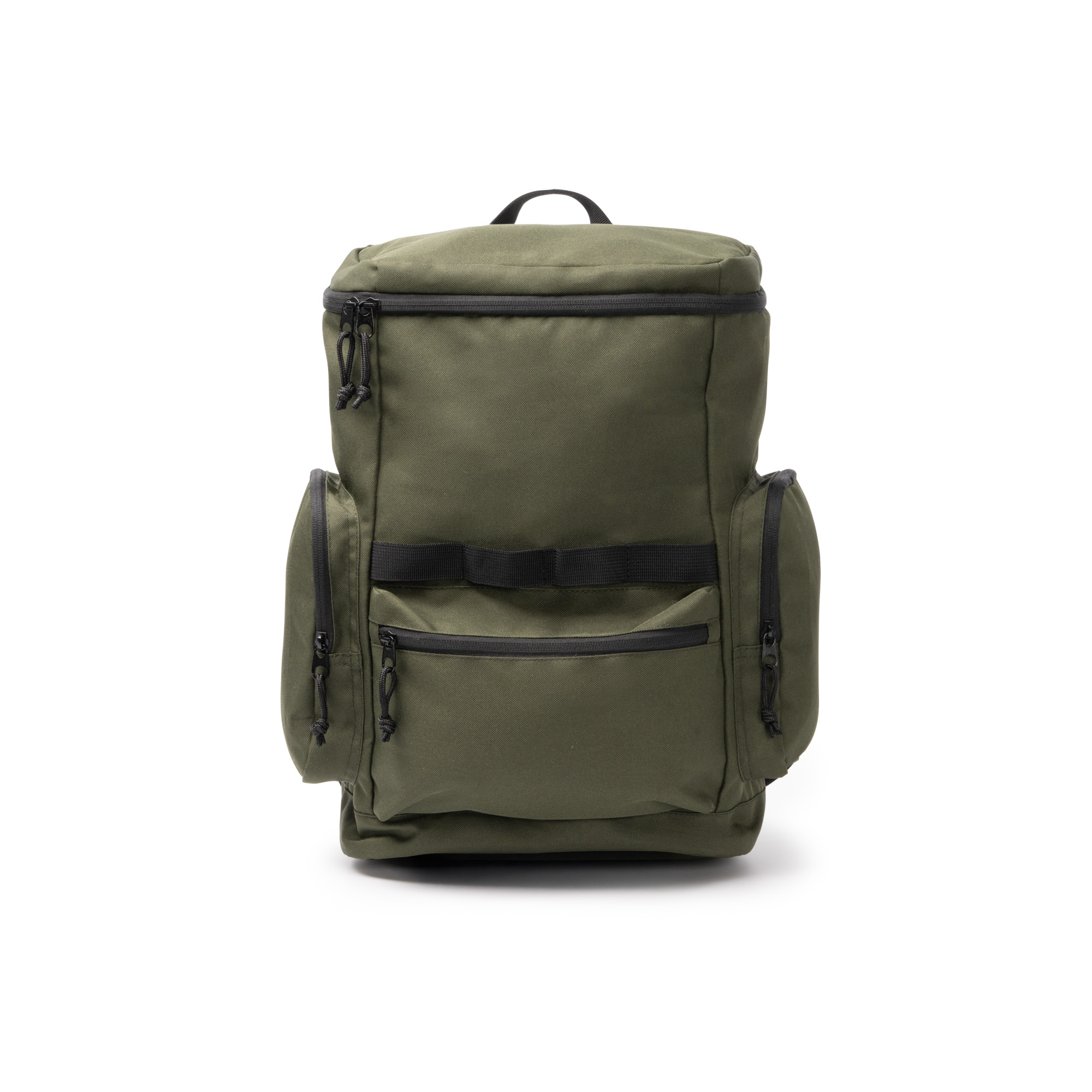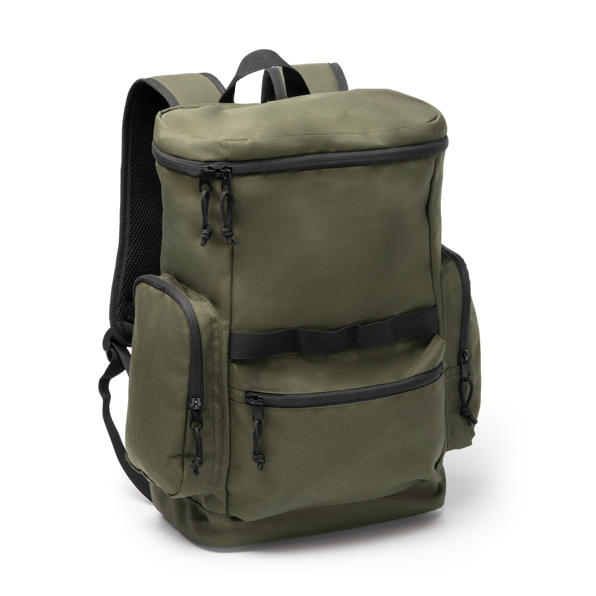 Mochila elaborada en RPET 600D. Compartimento principal con cierre de cremallera superior. Bolsillos laterales y frontal con cremallera y tiradores. Asa y espalda acolchadas.