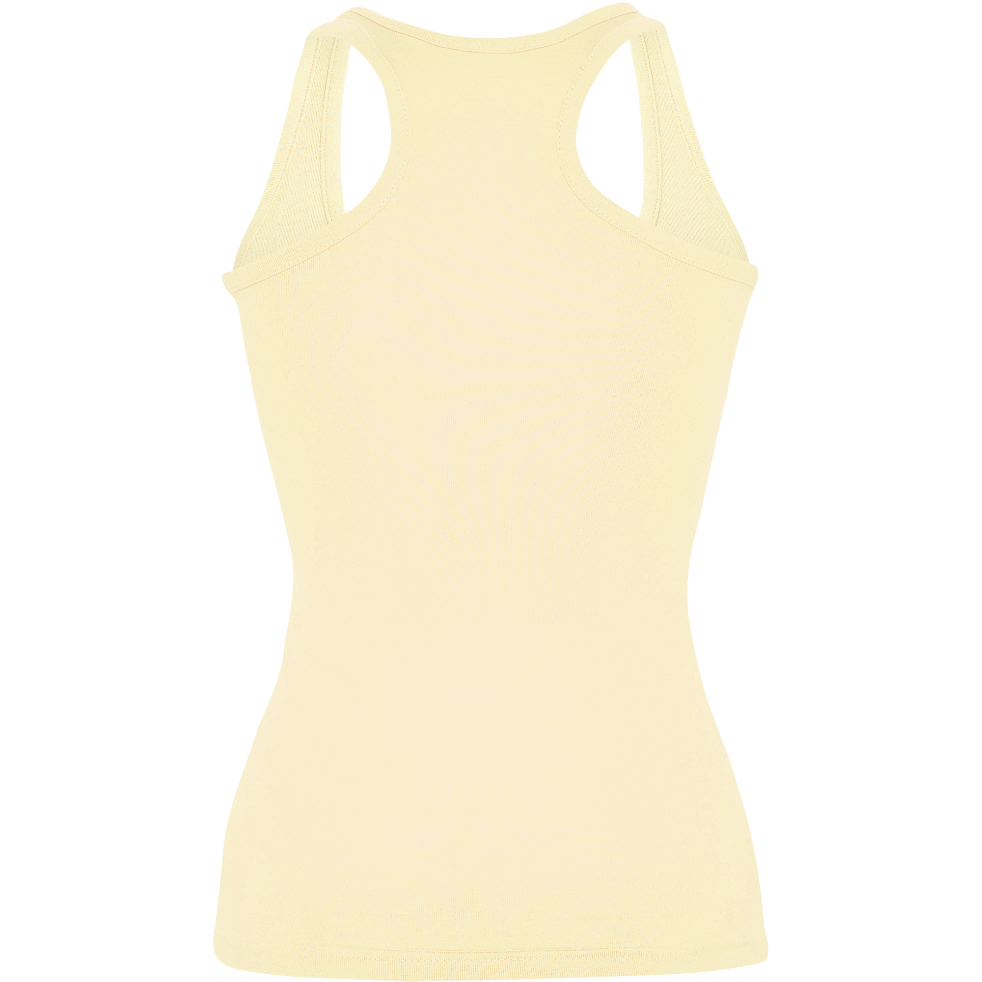 Camiseta de tirantes en punto de canalé entallada en cintura. Espalda nadadora. Cuello con amplio escote redondo y sisas con ribete del mismo tejido.