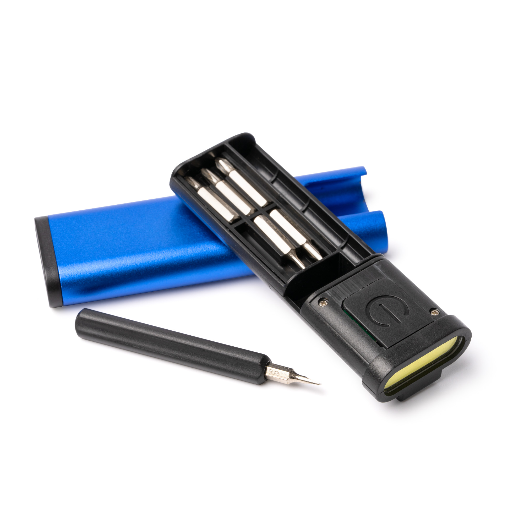 Linterna multifunción elaborada en aluminio. Con destornillador y puntas intercambiables en el interior. 2 pilas de botón CR2025 incluidas. Presentacion en caja blanca.