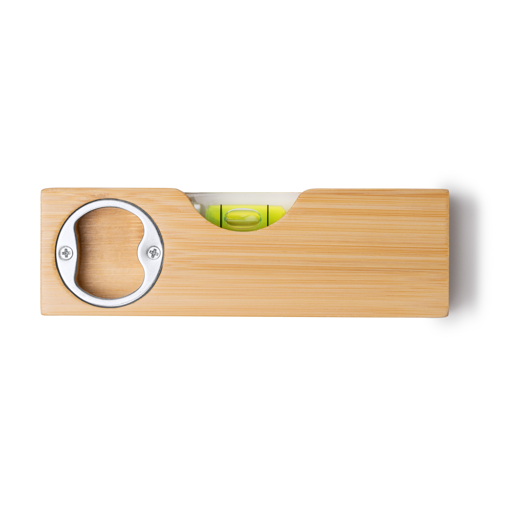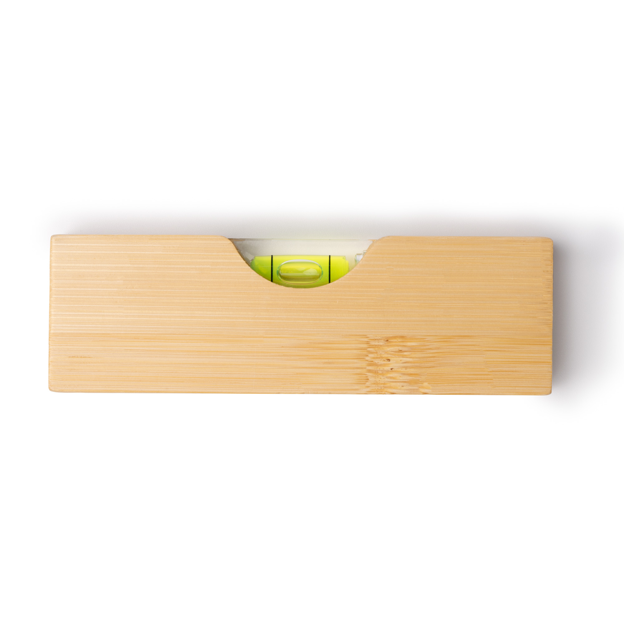 Nivel de burbuja con cuerpo de bambú y abridor metálico. Presentación en caja diseño eco.