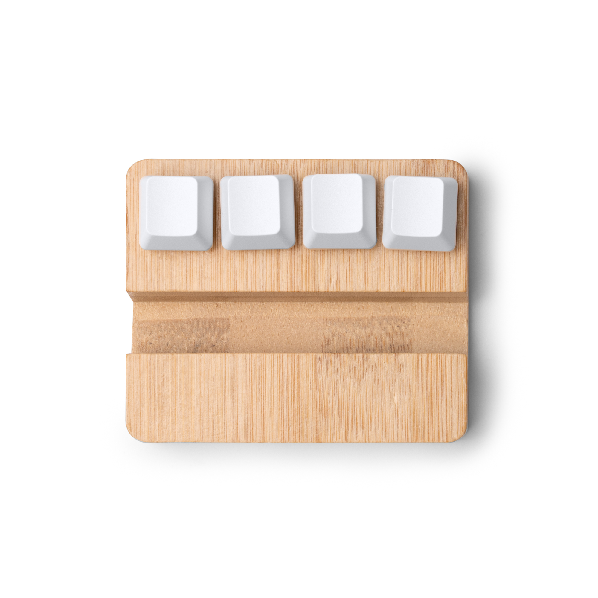 Soporte para smartphone con función antiestrés elaborado en bambú. Su diseño cuenta con cuatro botones tipo teclado que puedes pulsar y utilizar como medio antiestrés.