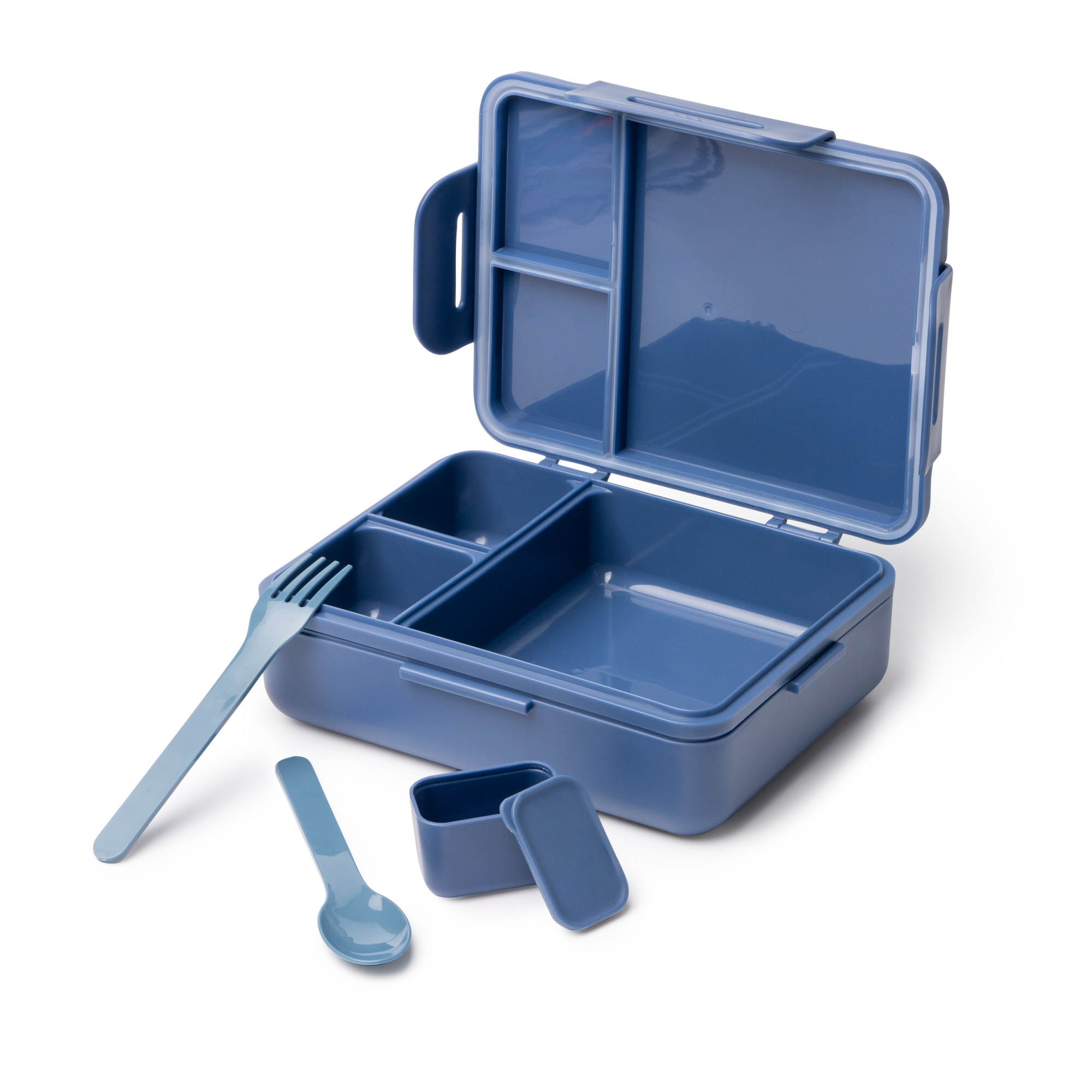Fiambrera de PP con tres compartimentos extraíbles de una pieza. Cierre hermético con sistema antigoteo. Compartimento adicional individual para condimentos. Incluye tenedor y cuchara. Capacidad 1,3L.