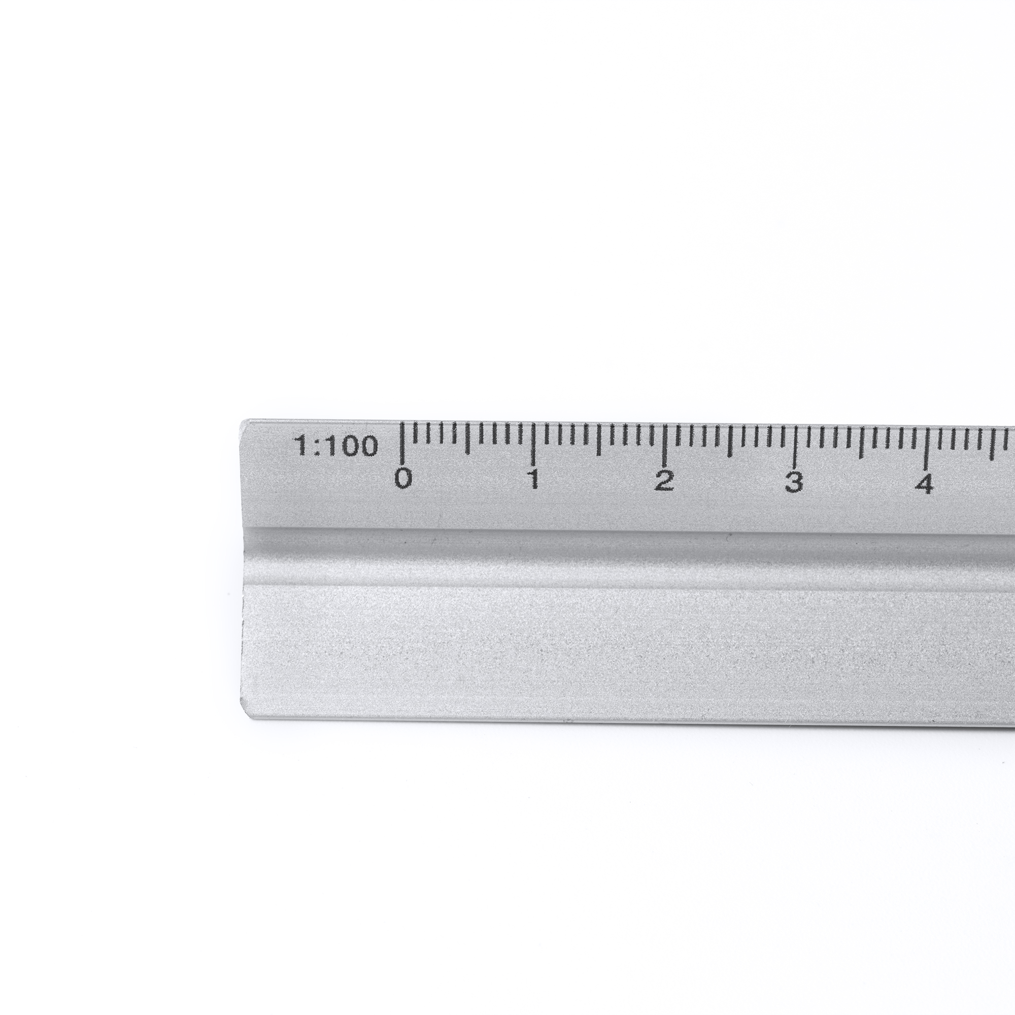Escalímetro de aluminio con diseño triangular de 30 cm. Escalas 1:20, 1:25, 1:50, 1:75 y 1:100. Una cara lisa especial para marcaje.