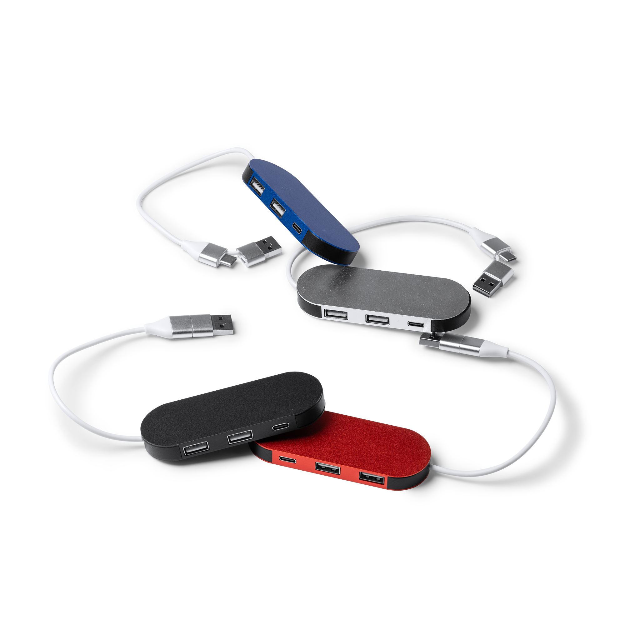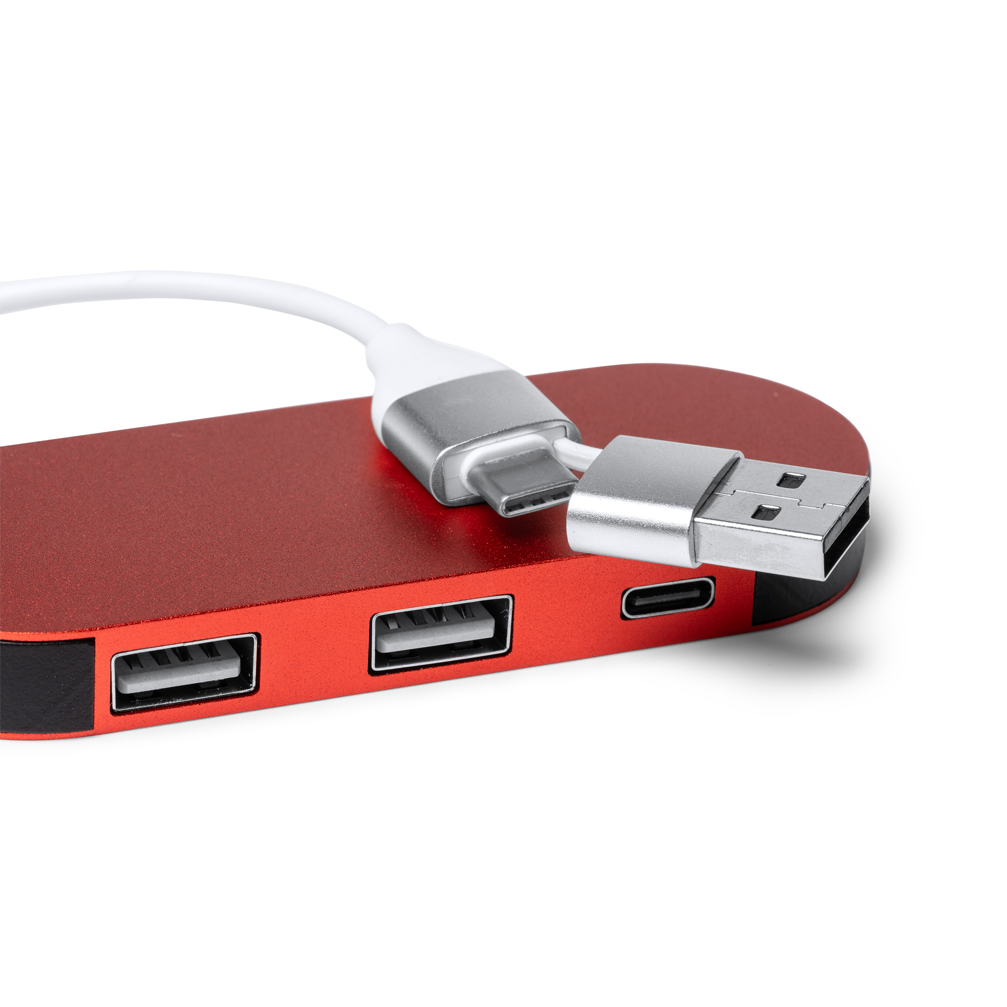 Puerto USB realizado en aluminio reciclado. Cuenta con entrada Tipo C y adaptador a USB. Con 2 salidas USB y una Tipo C.