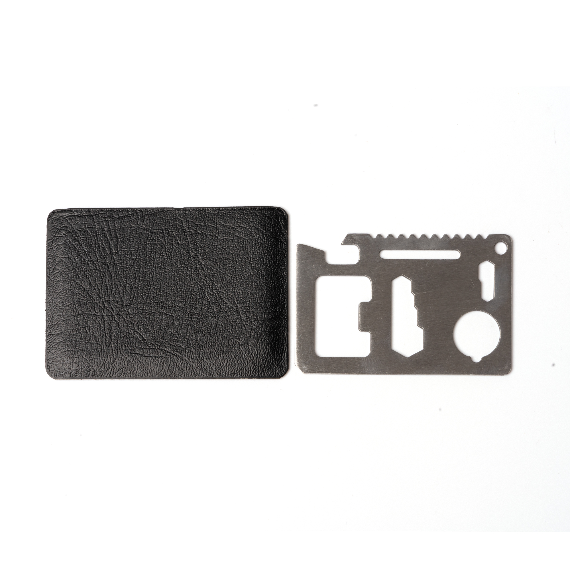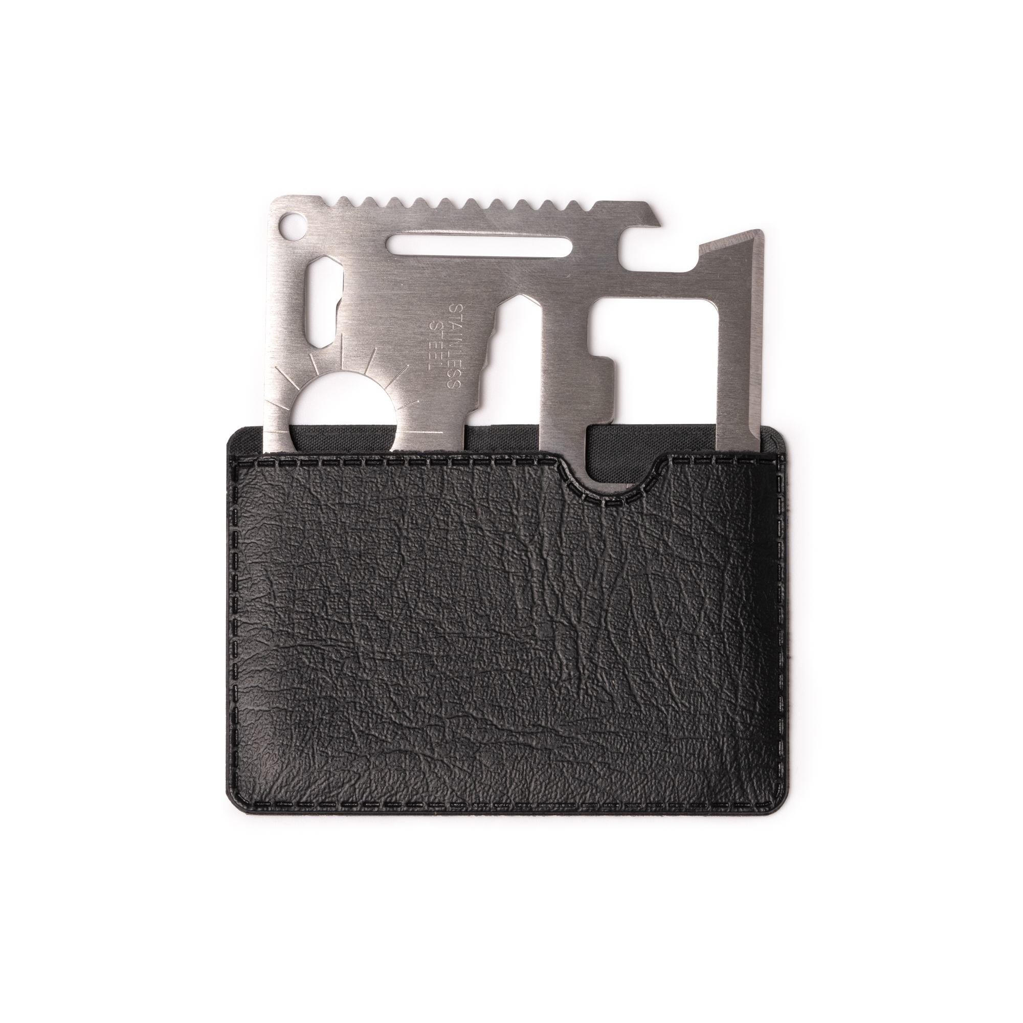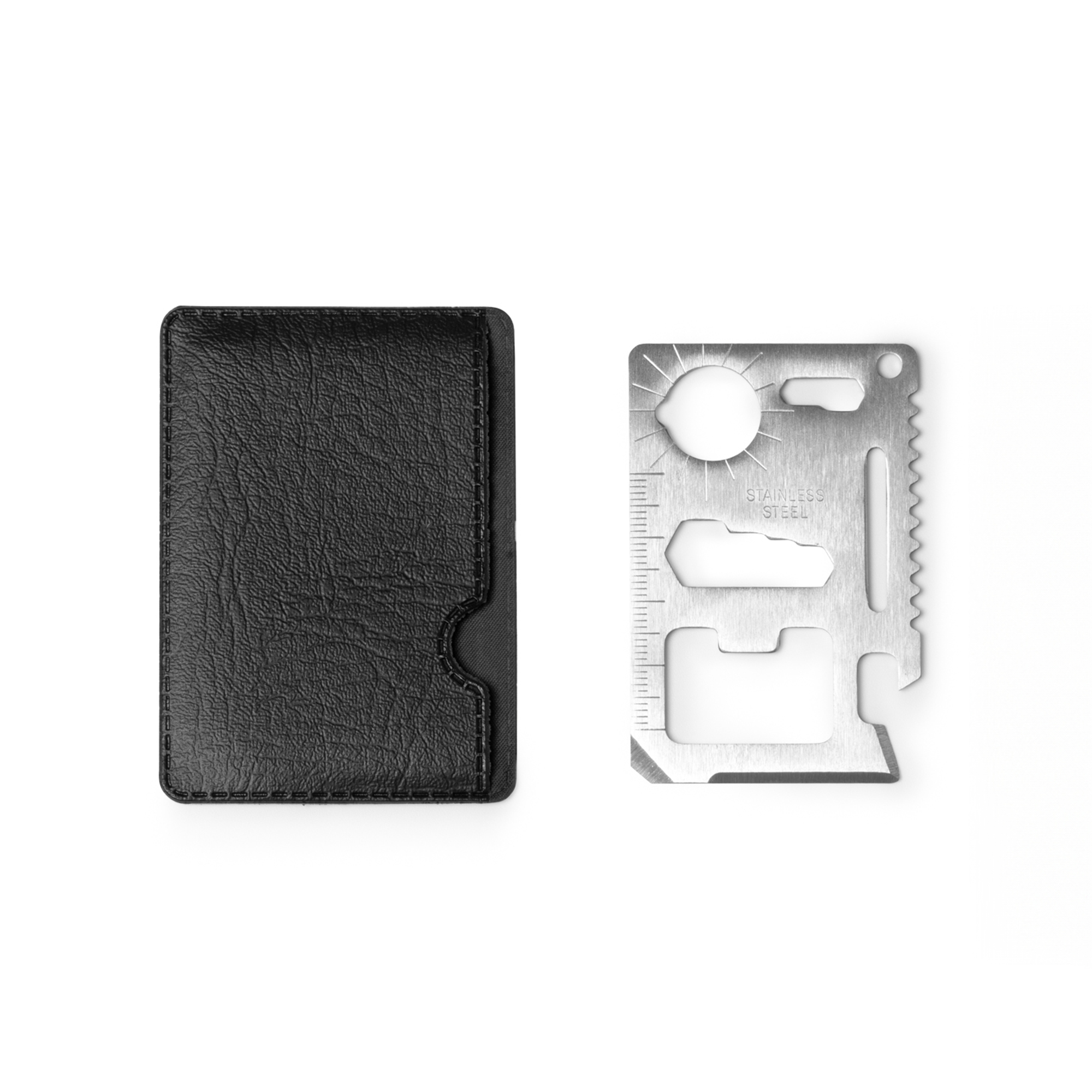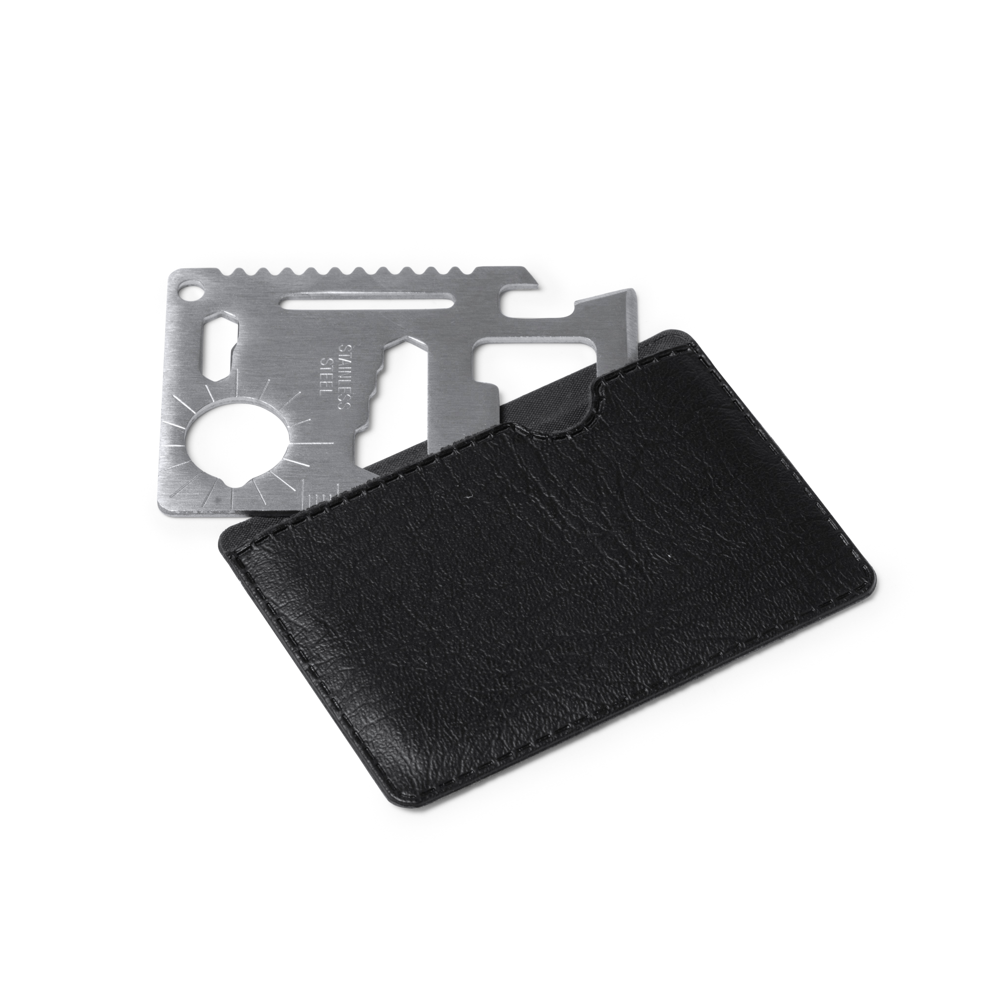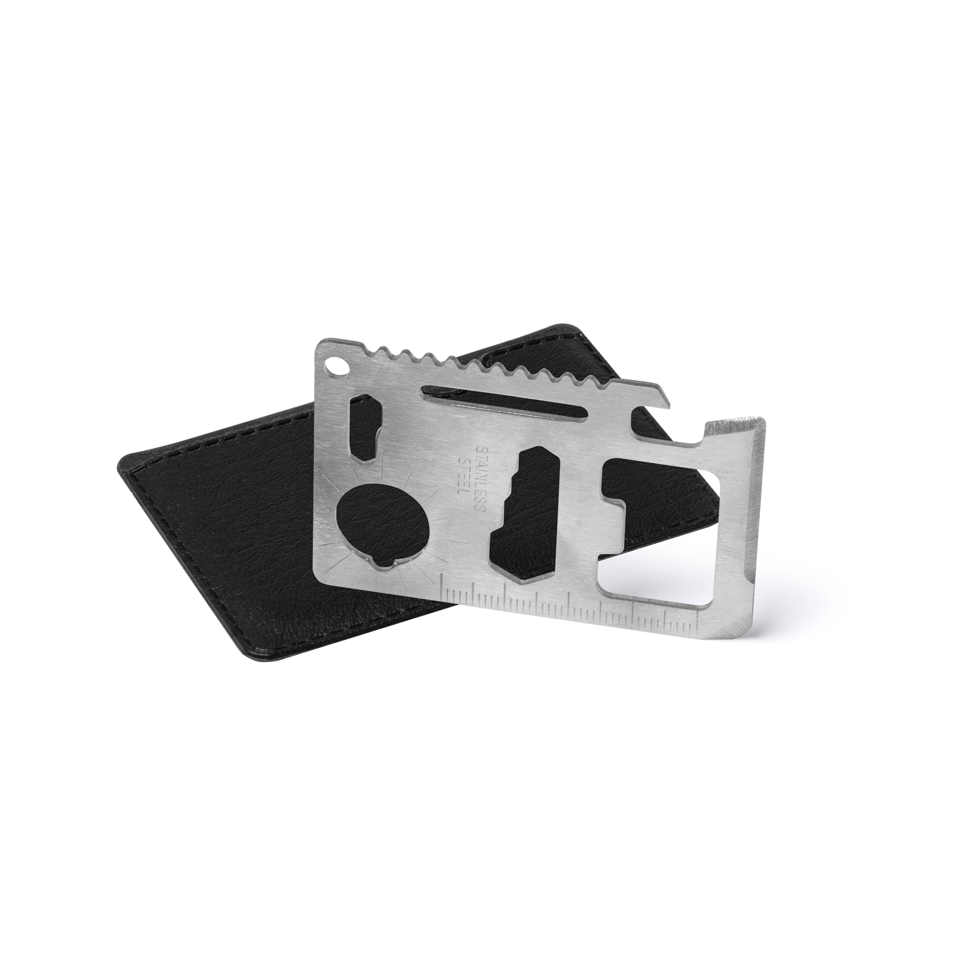 Multiherramienta de acero inoxidable. 11 funciones integradas. Versátil herramienta que incluye: abrelatas, cuchillo afilado, destornillador, regla, abrebotellas, llaves inglesas, llaves de mariposa, una sierra para pequeñas tareas y un indicador de dirección. Presentado en funda de PU.