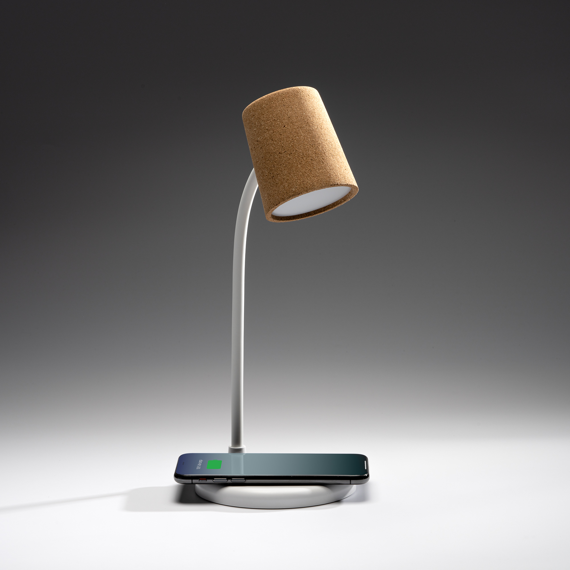 Lámpara elaborada en ABS y corcho. Luz led con tres tipo de iluminación con ajuste de intensidad mediante botón multifunción integrado en la base. Incluye altavoz inalámbrico de 3W de potencia para reproducción de audio mediante conexión Bluetooth. Con indicador luminoso de conexión. Con base de carga inalámbrica con potencia de 10W para recarga de dispositivos provistos de esta tecnología.