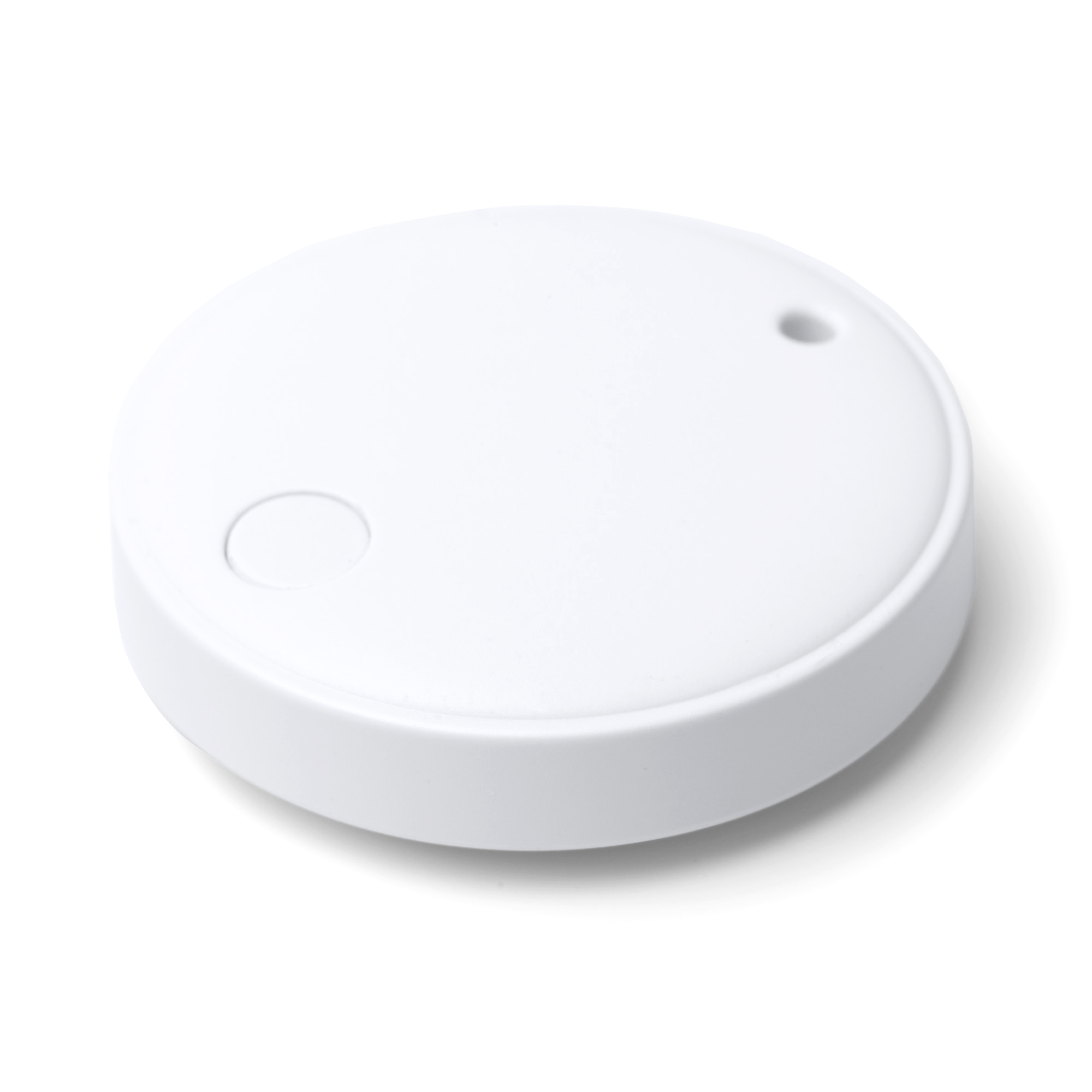 Localizador inteligente elaborado en ABS con llavero. Compatible con iOS y Android mediante app Find My. Con señal acústica. Resistente al agua. Funciona mediante pila CR2032. Incluye anilla metálica. Presentación caja diseño.