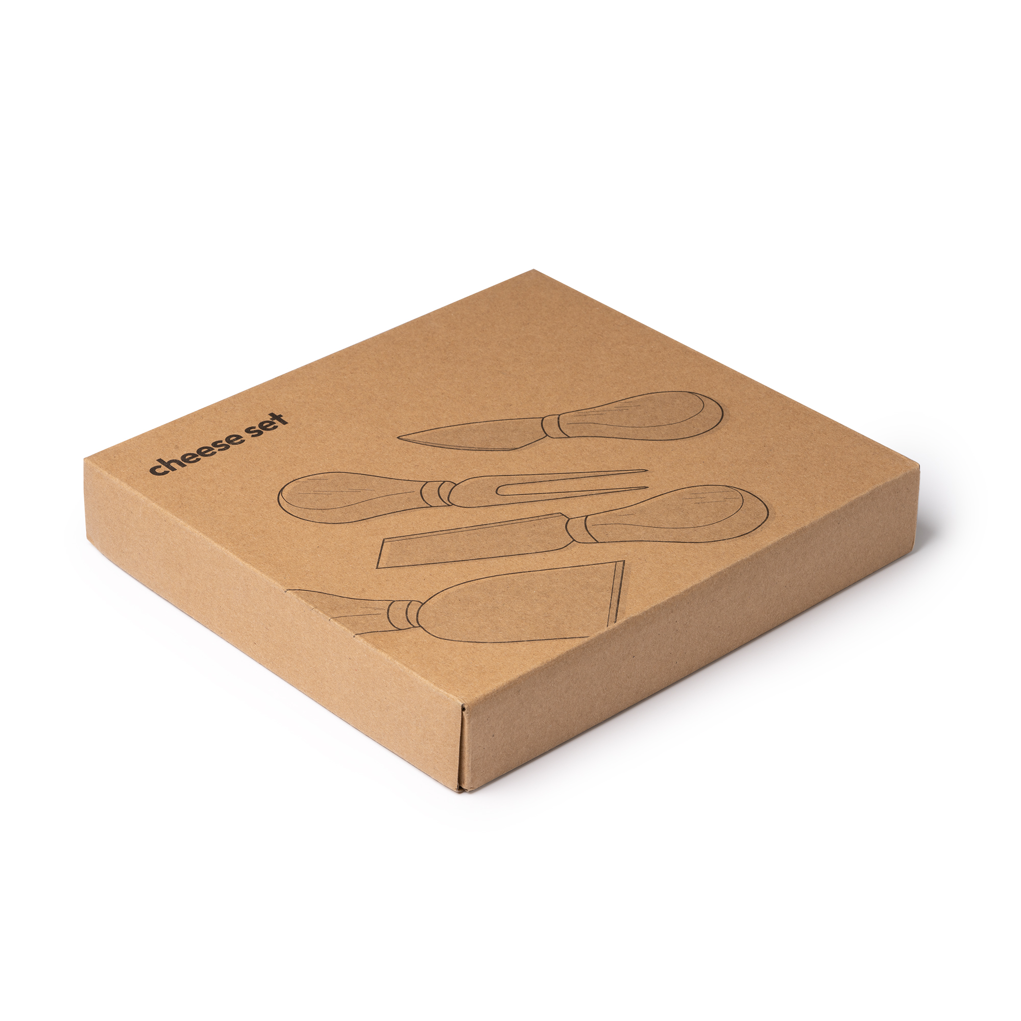 Set para quesos con 4 utensilios de acero inoxidable y mango de madera.