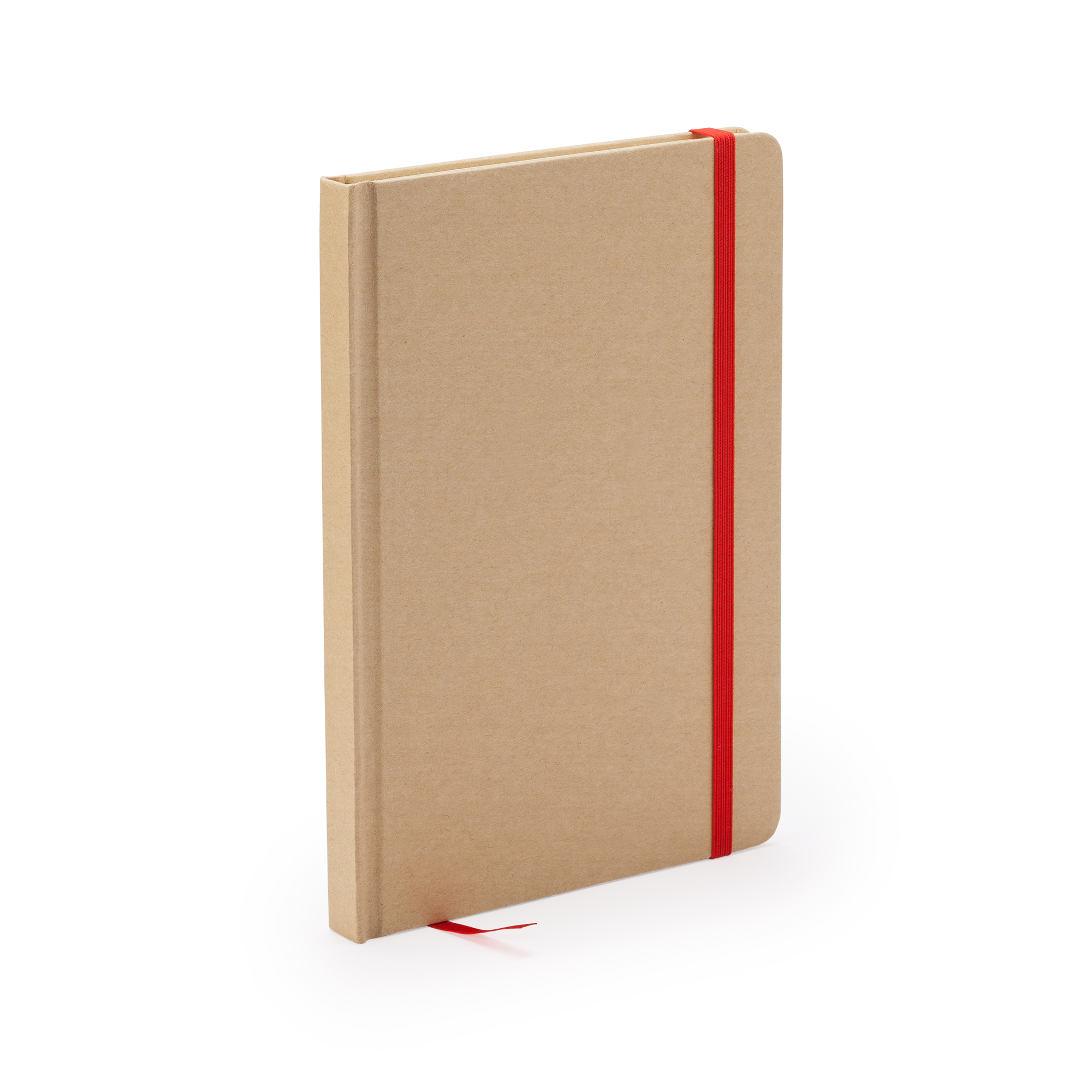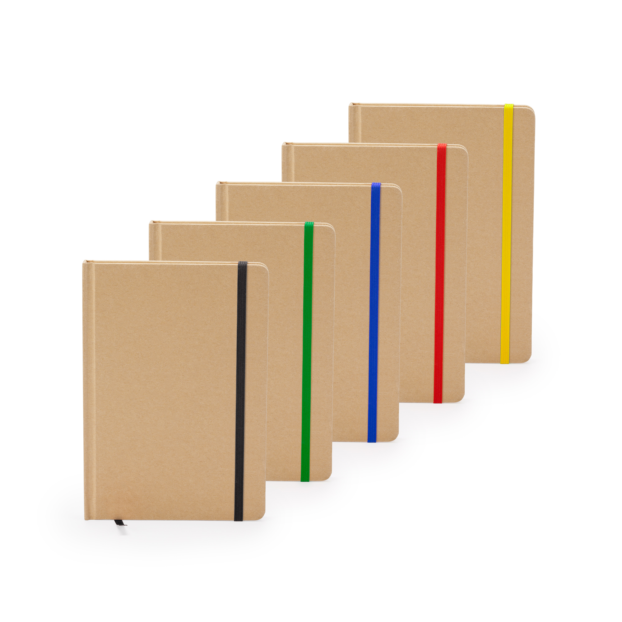 Bloc de notas A5. Tapa rígida de cartón reciclado. Marcapáginas y banda elástica a color. 100 hojas lisas.