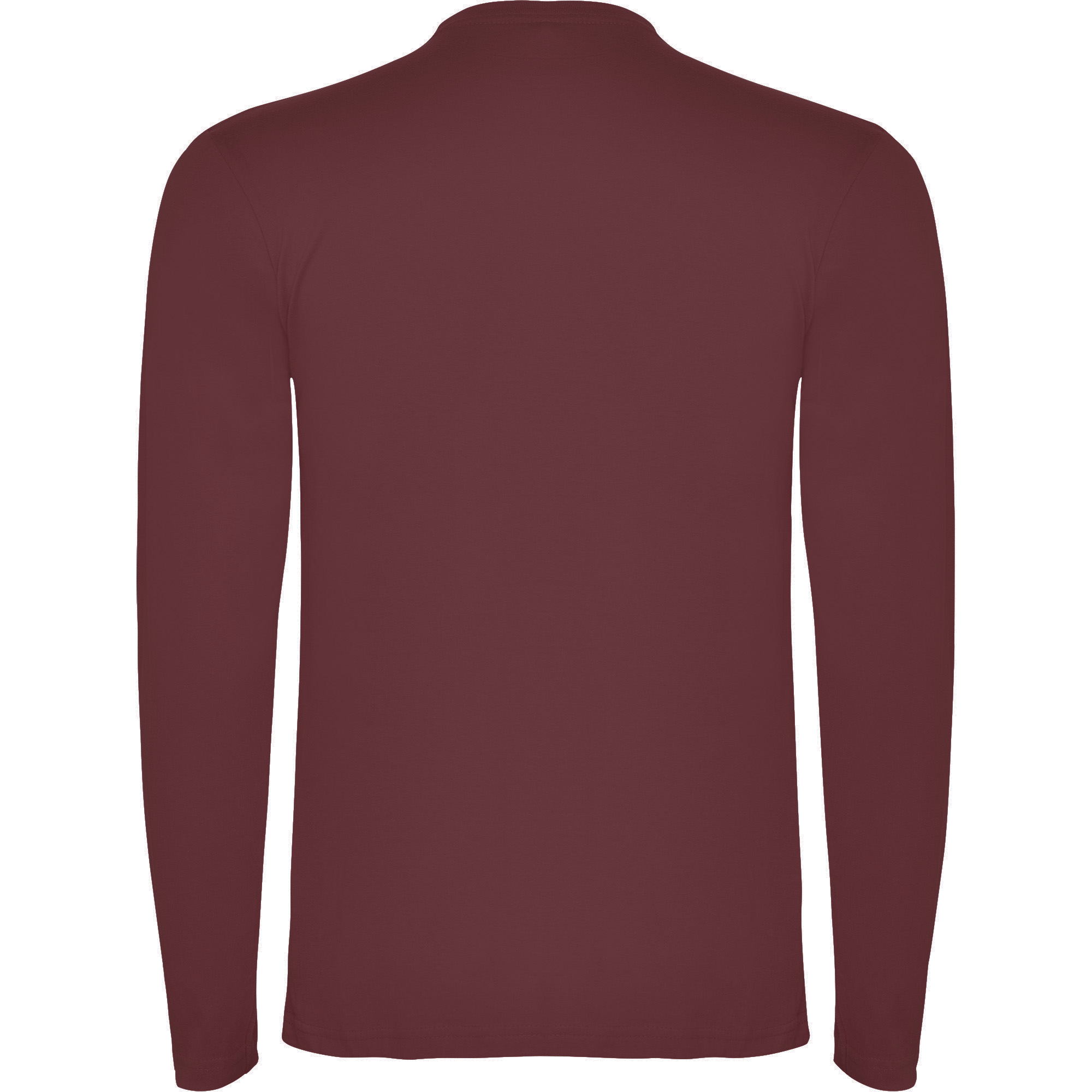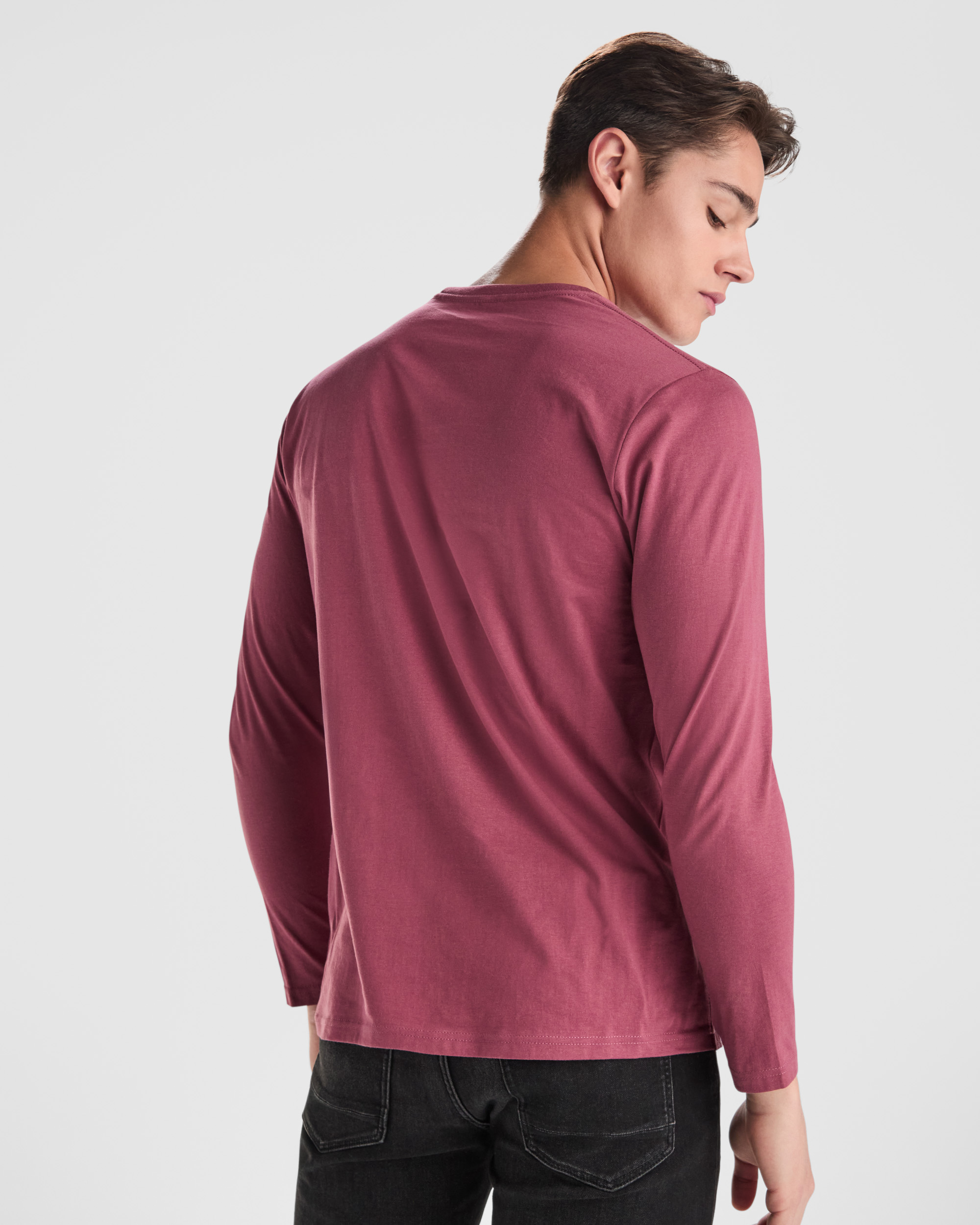 Camiseta de manga larga tubular en tallas de adulto y costuras laterales en tallas de niño. Cuello redondo en canalé 1×1 (4 capas). Cubrecosturas en cuello del mismo tejido.