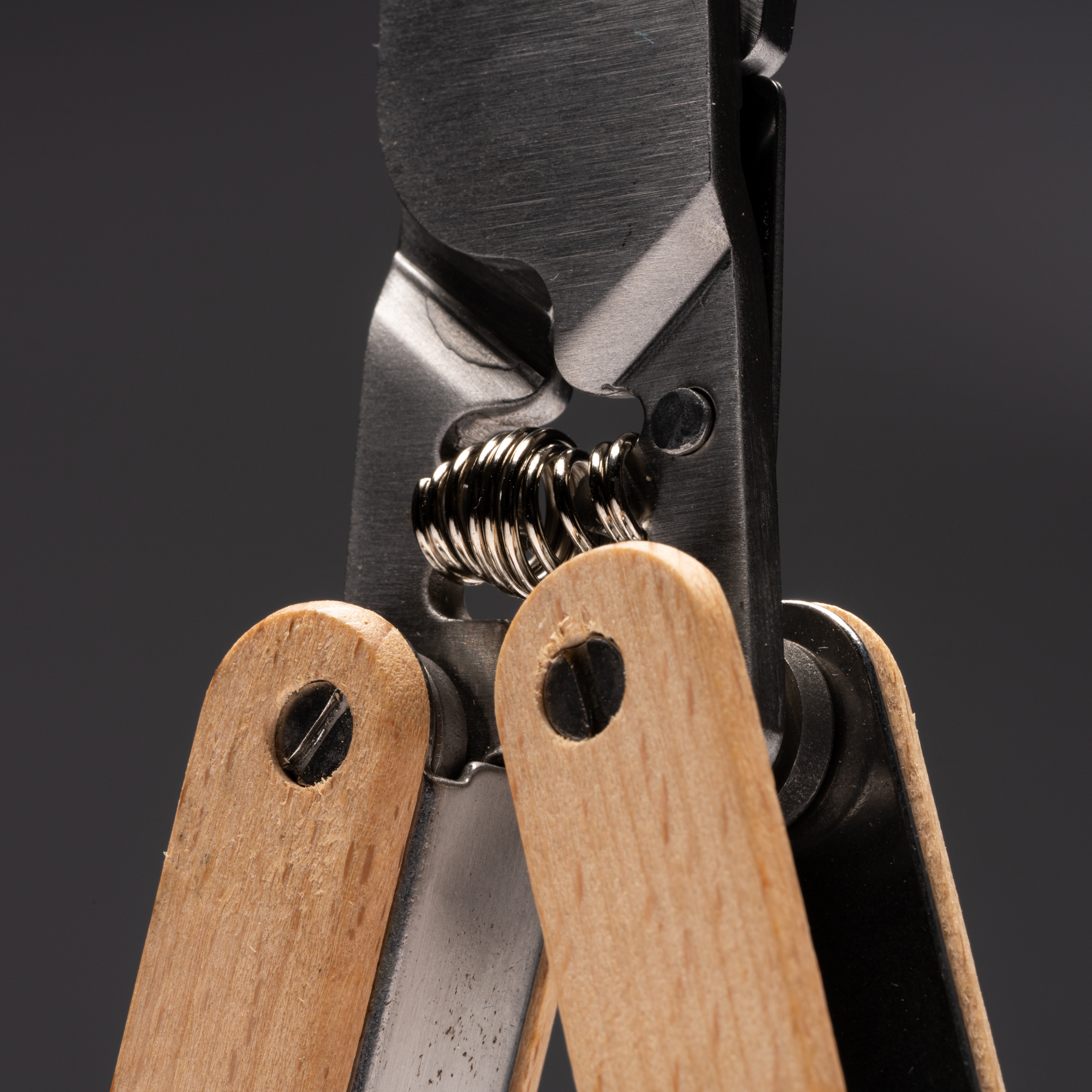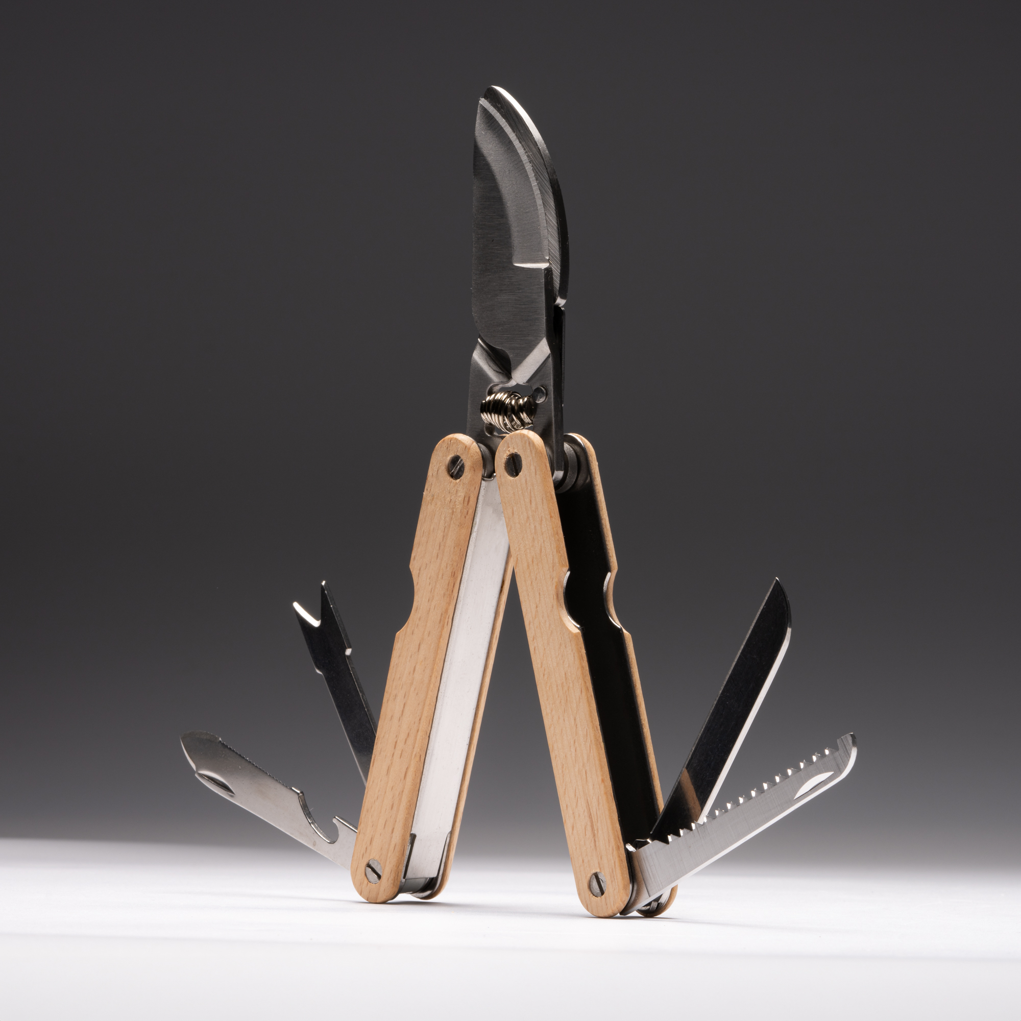 Multiherramientas de acero inoxidable y empuñadura de madera. 6 funciones: tijera para podar, navaja, sierra, lima, destornillador y abridor.