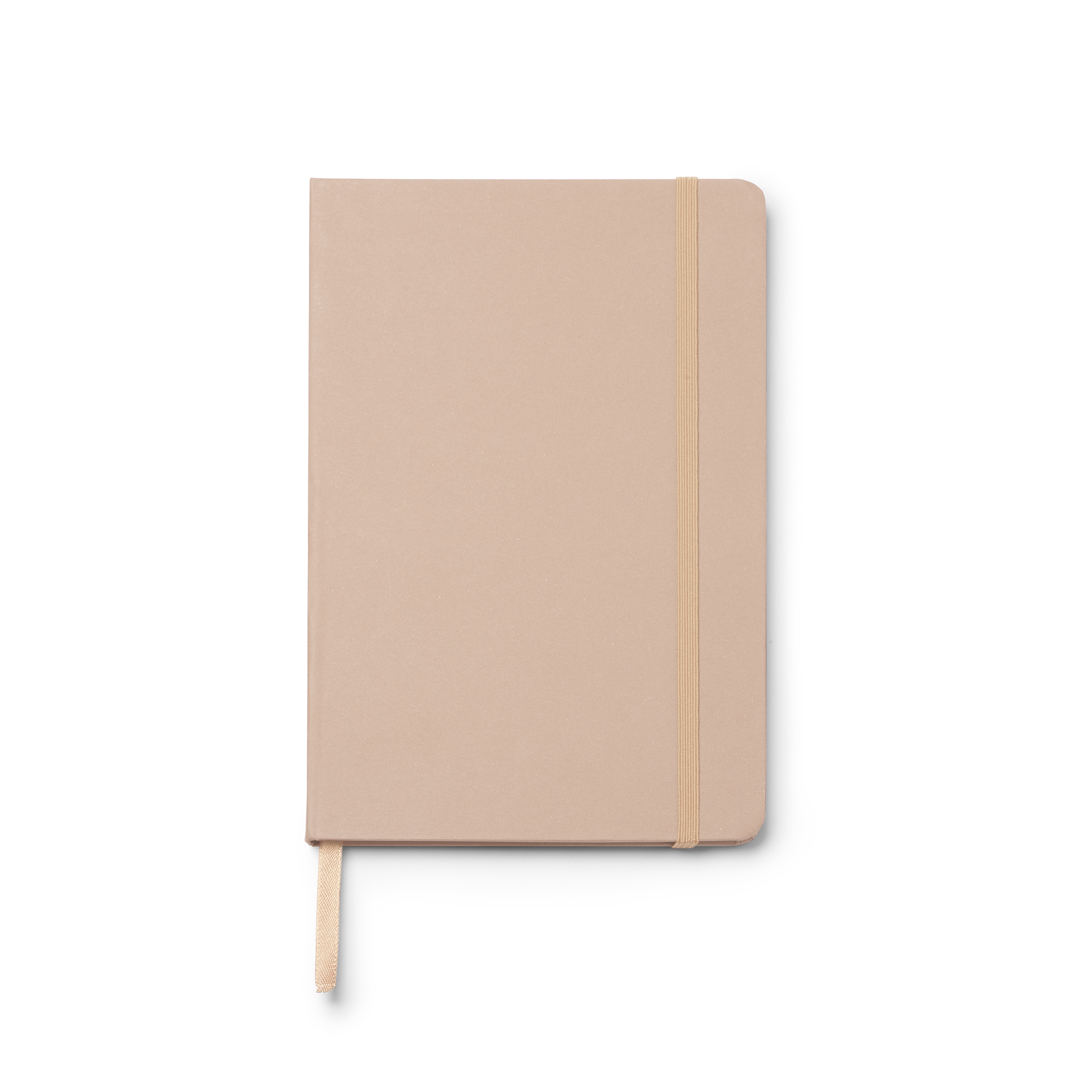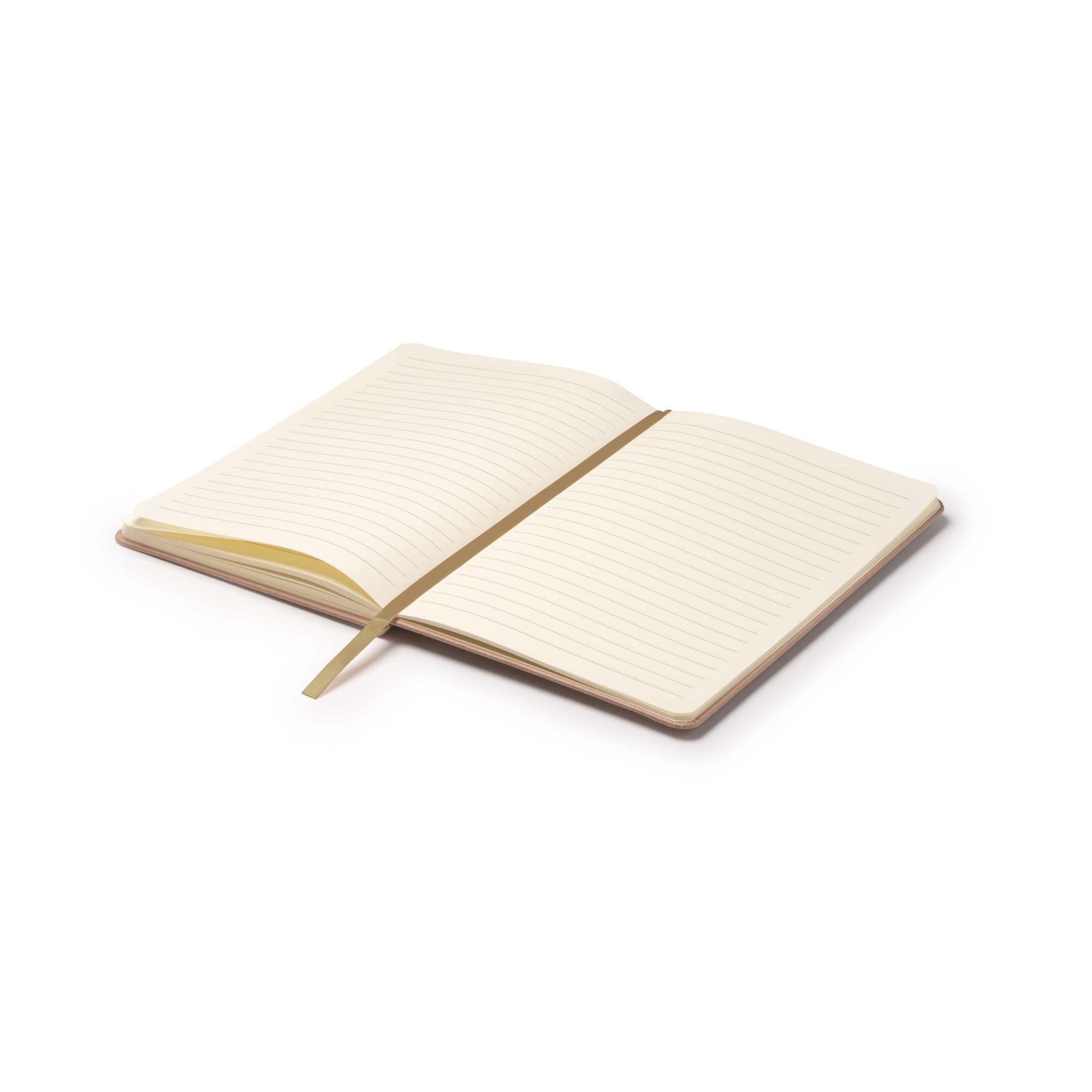 Bloc de notas tamaño A5 con tapas duras elaborado a partir de restos de frutas. Incluye marcapáginas y banda elásticas a juego. Interior con 80 hojas a rayas, ideal para tomar notas con un toque ecológico y original.
