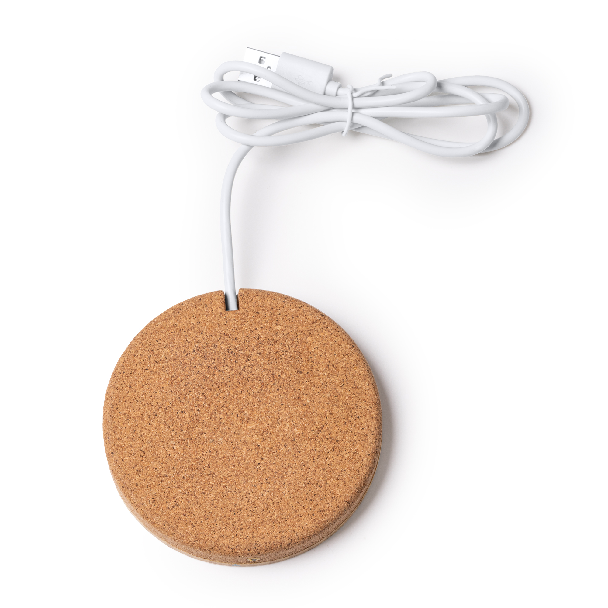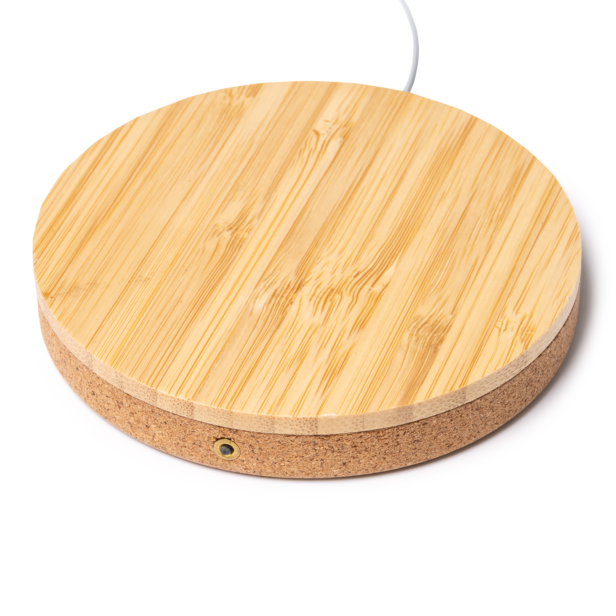Cargador inalámbrico con cuerpo combinado materiales ecológicos: corcho y bambú. Con potencia de 10W. Cuenta con indicador luminoso de carga. Compatible con dispositivos provistos de tecnología de carga inalámbrica. Además, cuenta con un cable de conexión USB integrado. Presentación en caja de diseño eco.