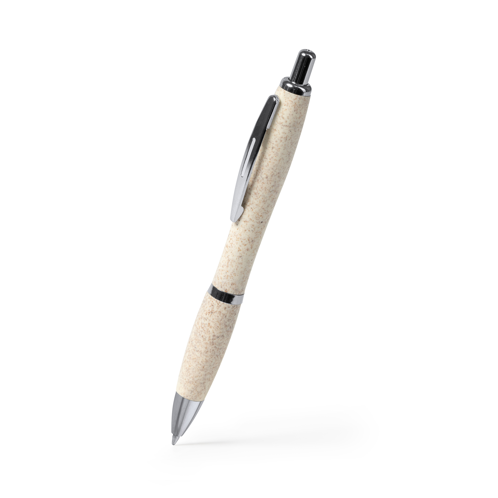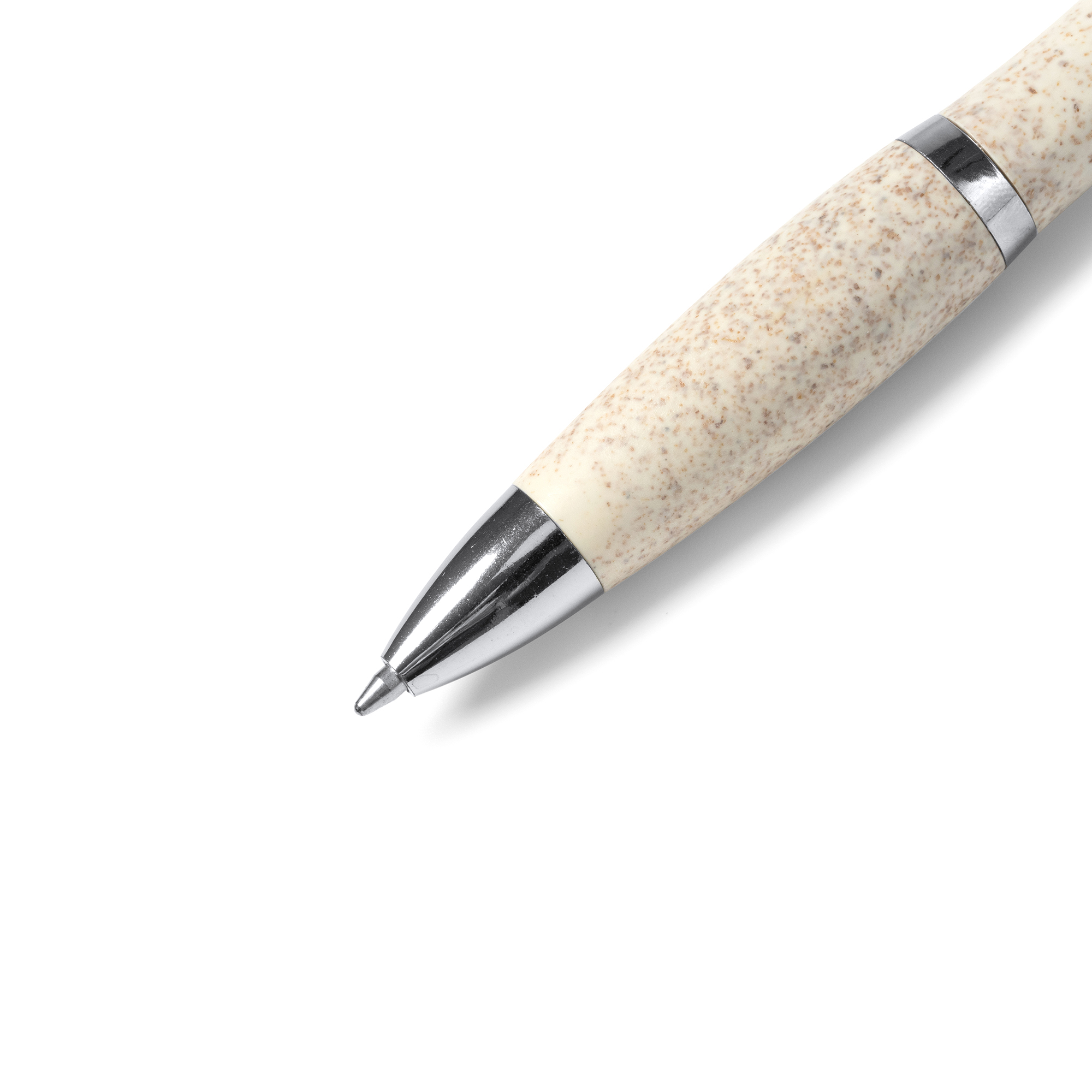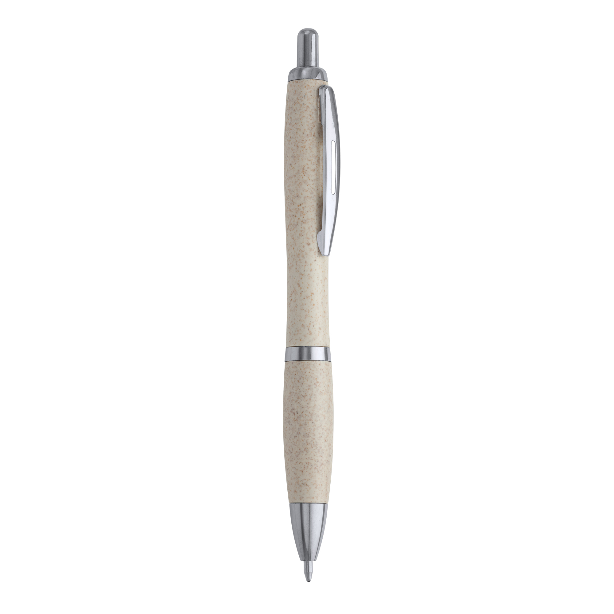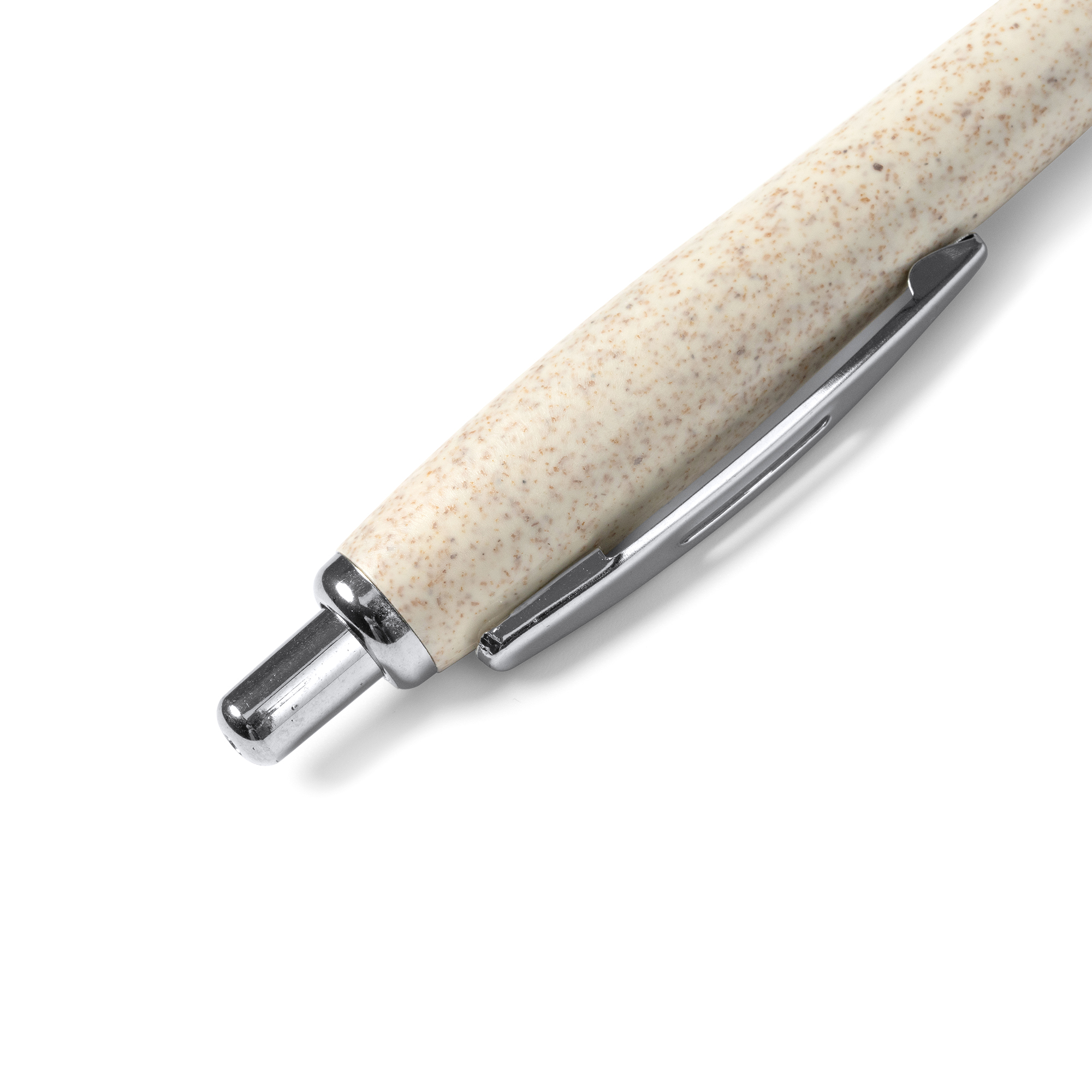 Bolígrafo con pulsador de fibra de trigo y ABS. Detalles con acabados cromados. Tinta azul.