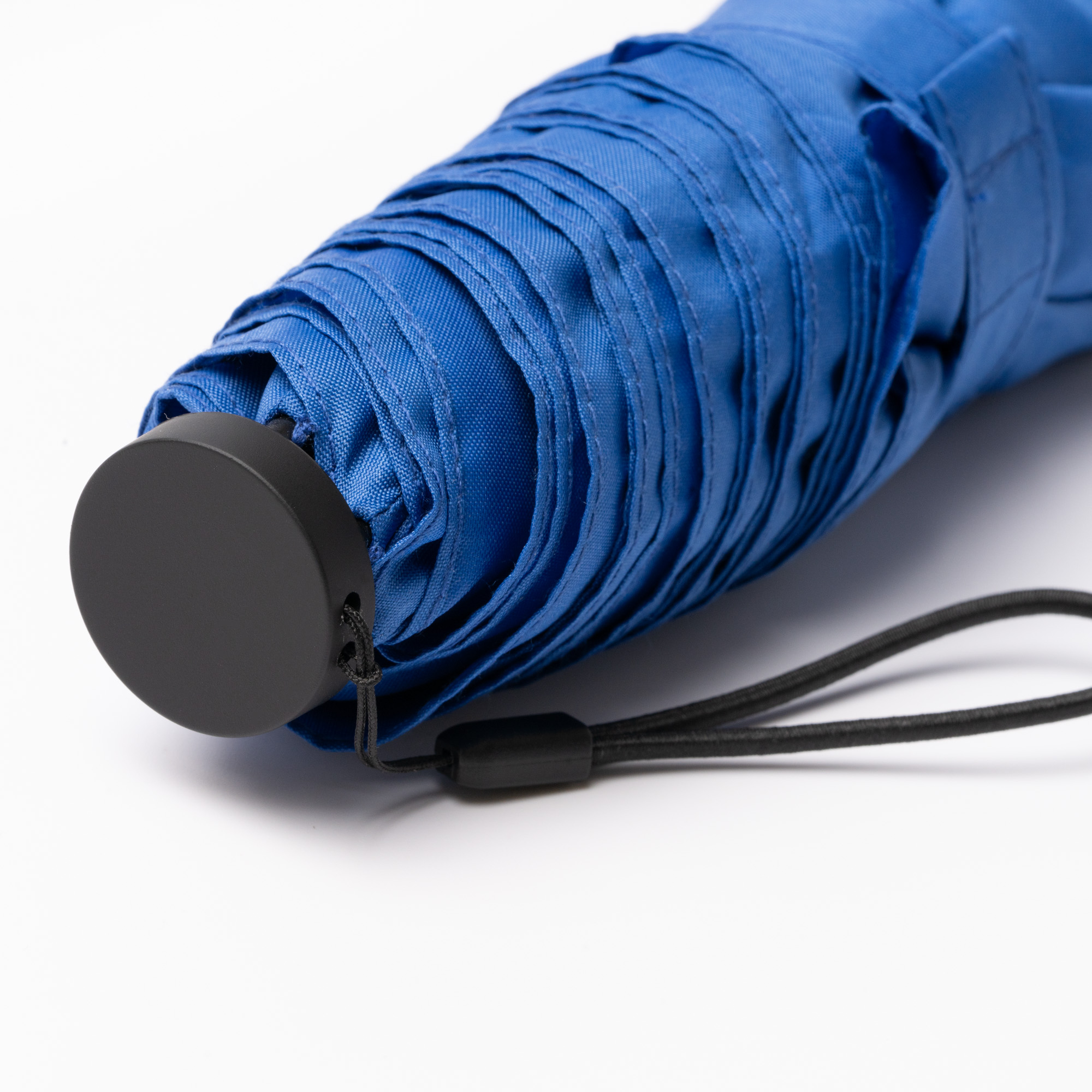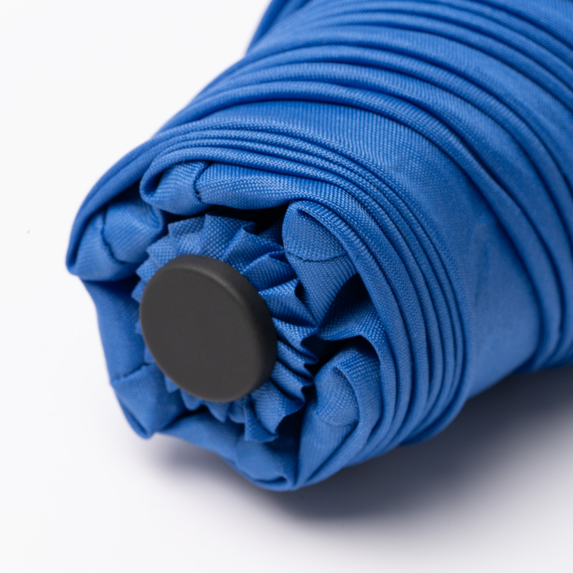 Paraguas mini plegable con cuerpo de aluminio. Diseño ligero. Tejido pongee 190T RPET con protección UV UPF50. Varillas de fibra de vidrio con sistema antiventisca. Cierre de velcro. Incluye funda a juego.