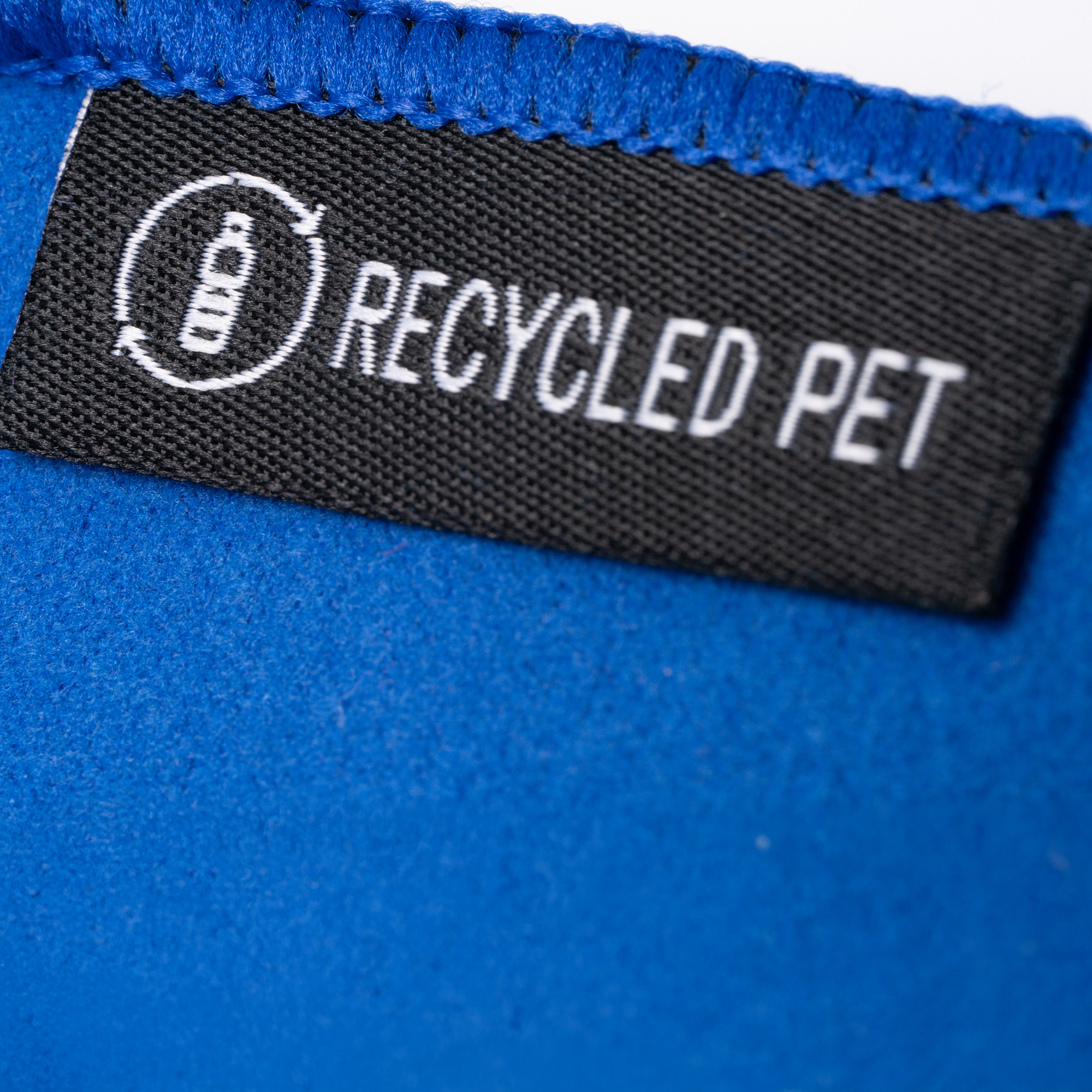 Toalla ligera de microfibra realizada en RPET con cinta para plegar y fácil transporte. Remallado con filamento de poliéster.