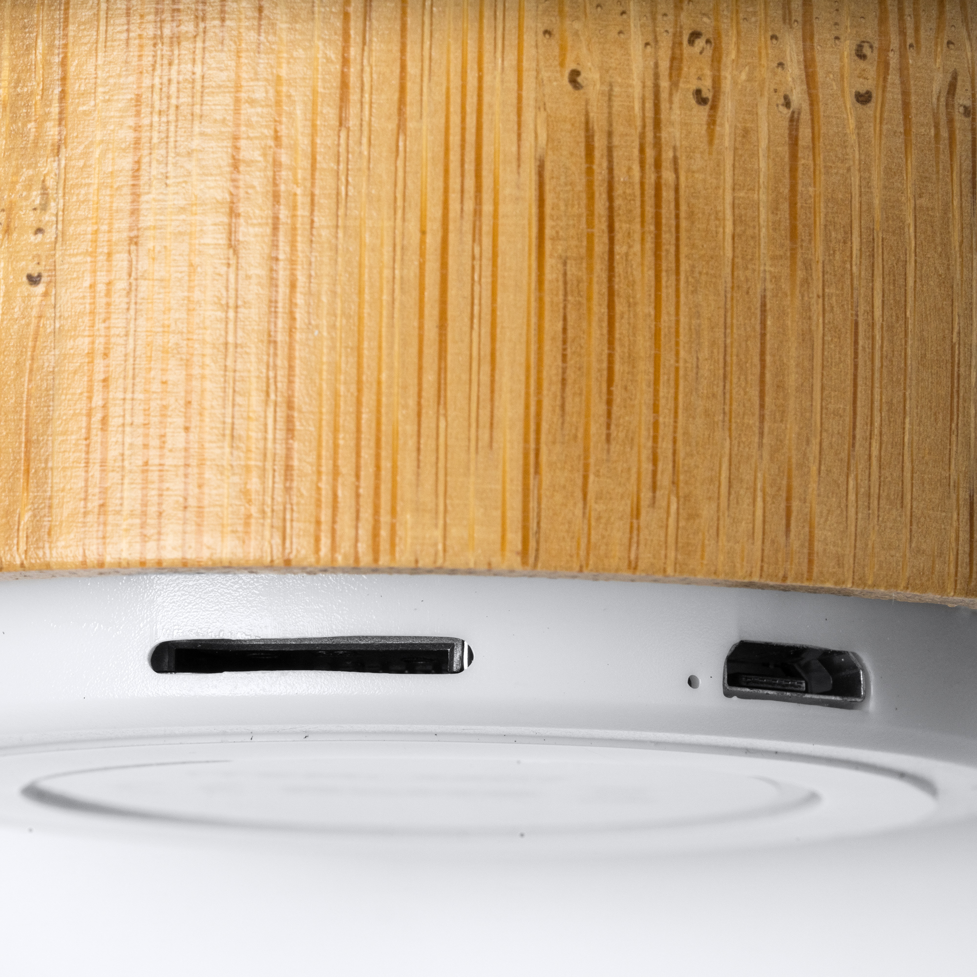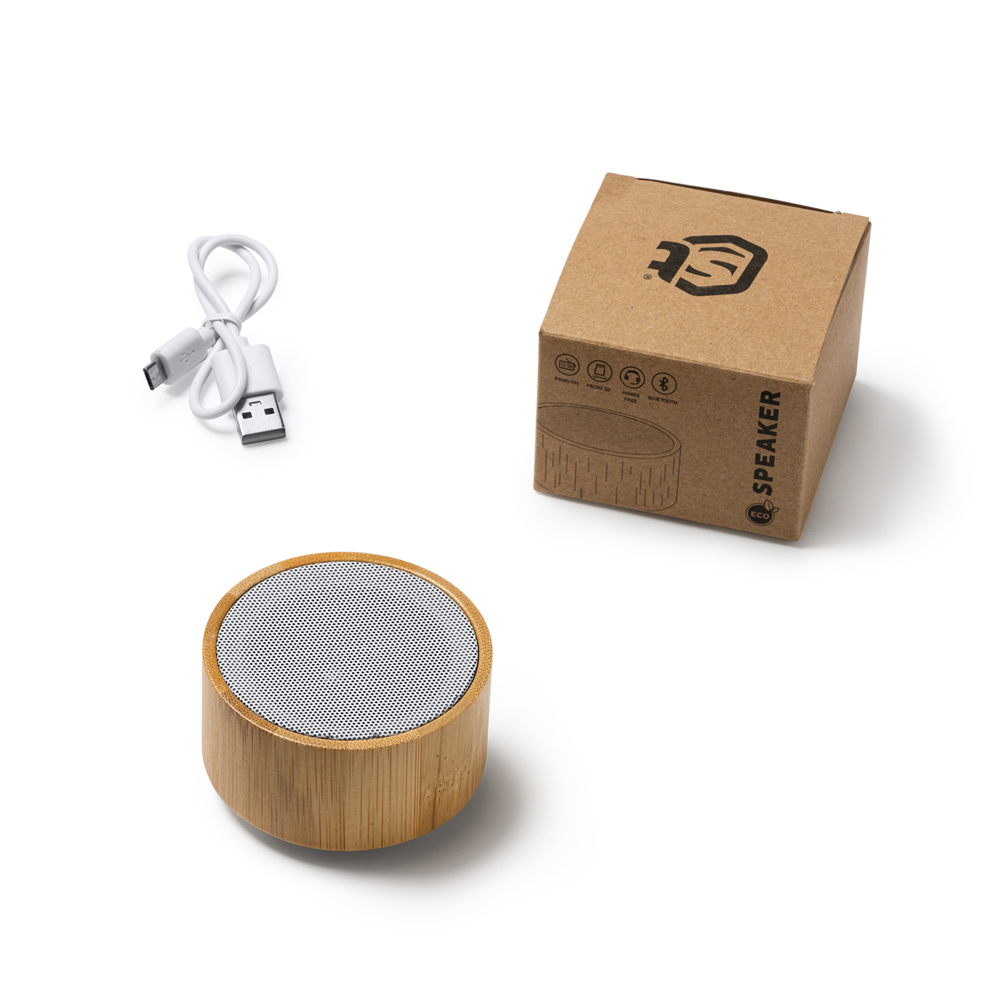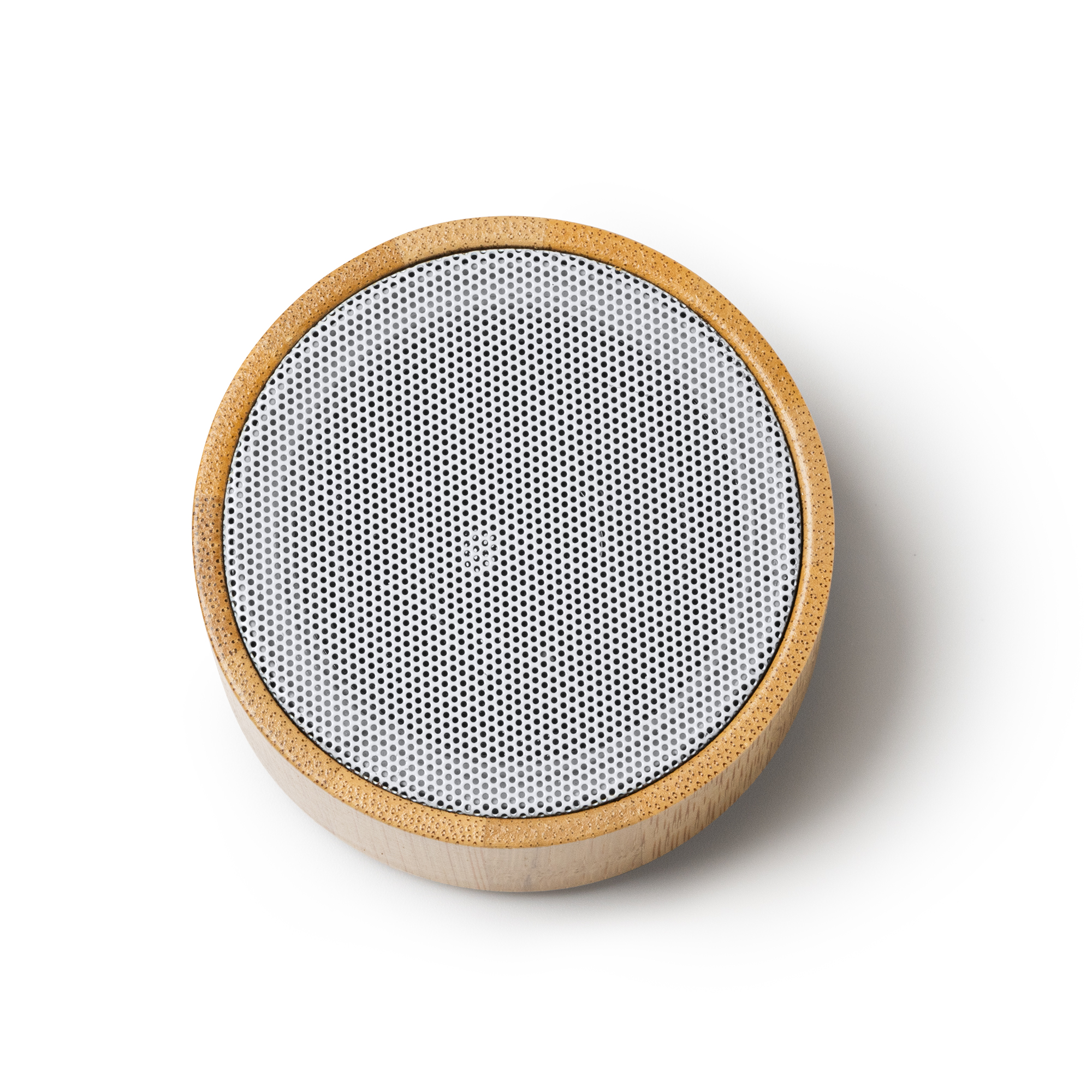 Altavoz inalámbrico redondo con cuerpo elaborado en ABS y bambú. Con base antideslizante y rejilla en color blanco. Con batería recargable y potencia de 3W. Tiempo máximo de reproducción de hasta 4 horas. Con función manos libres y micrófono para realizar llamadas. Reproducción de audio Bluetooth, Radio FM y mediante tarjeta MicroSD. Incluye botones en la parte trasera para control de reproducción de audio y llamadas.