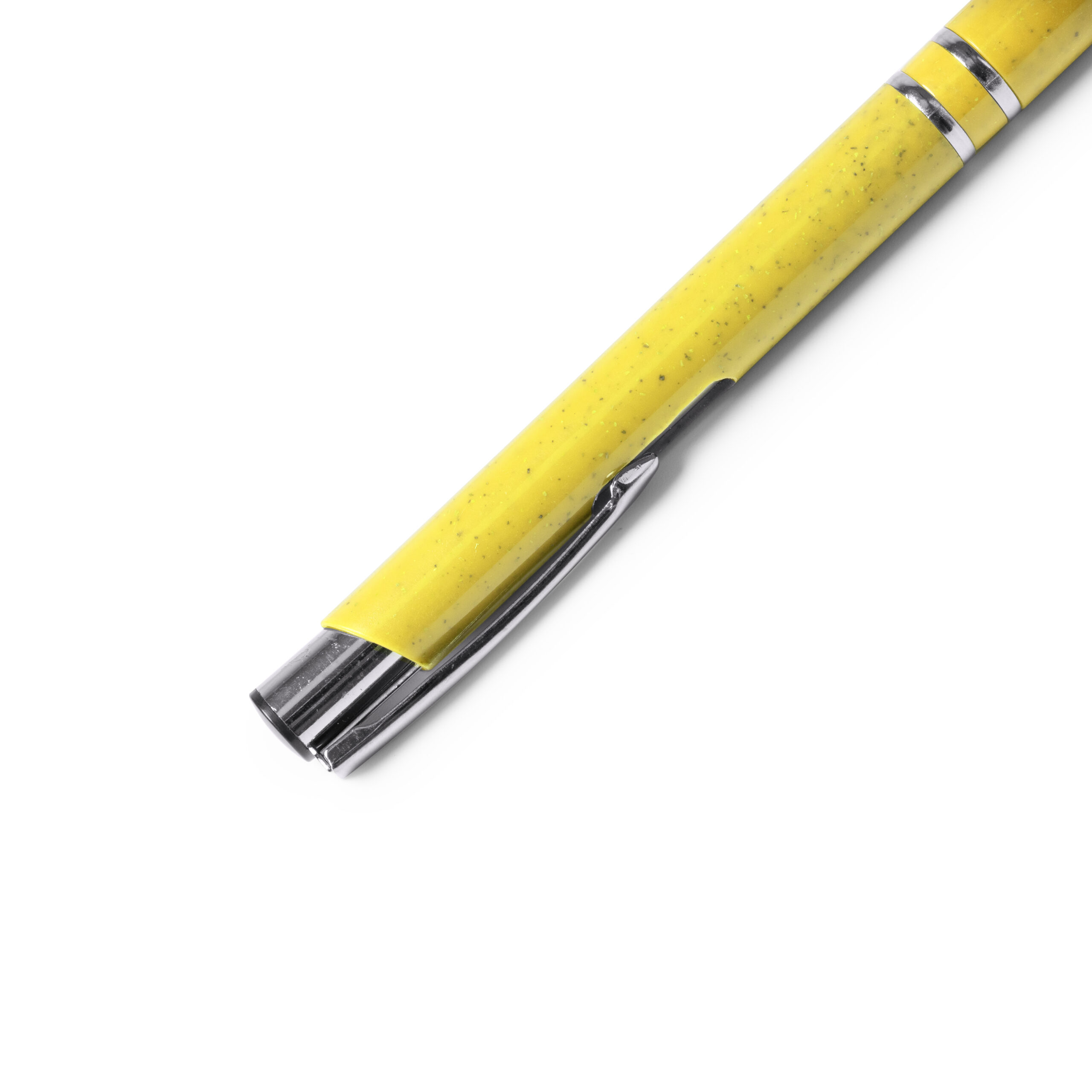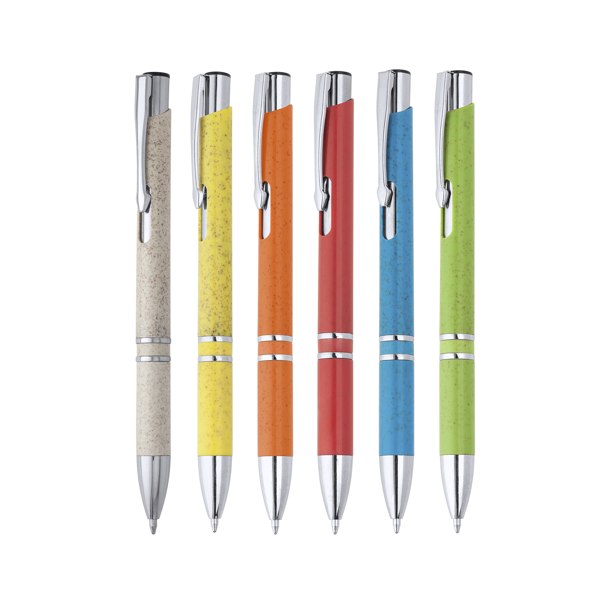 Bolígrafo pulsador de fibra de trigo y ABS con acabados plateados. Carga jumbo de tinta azul.