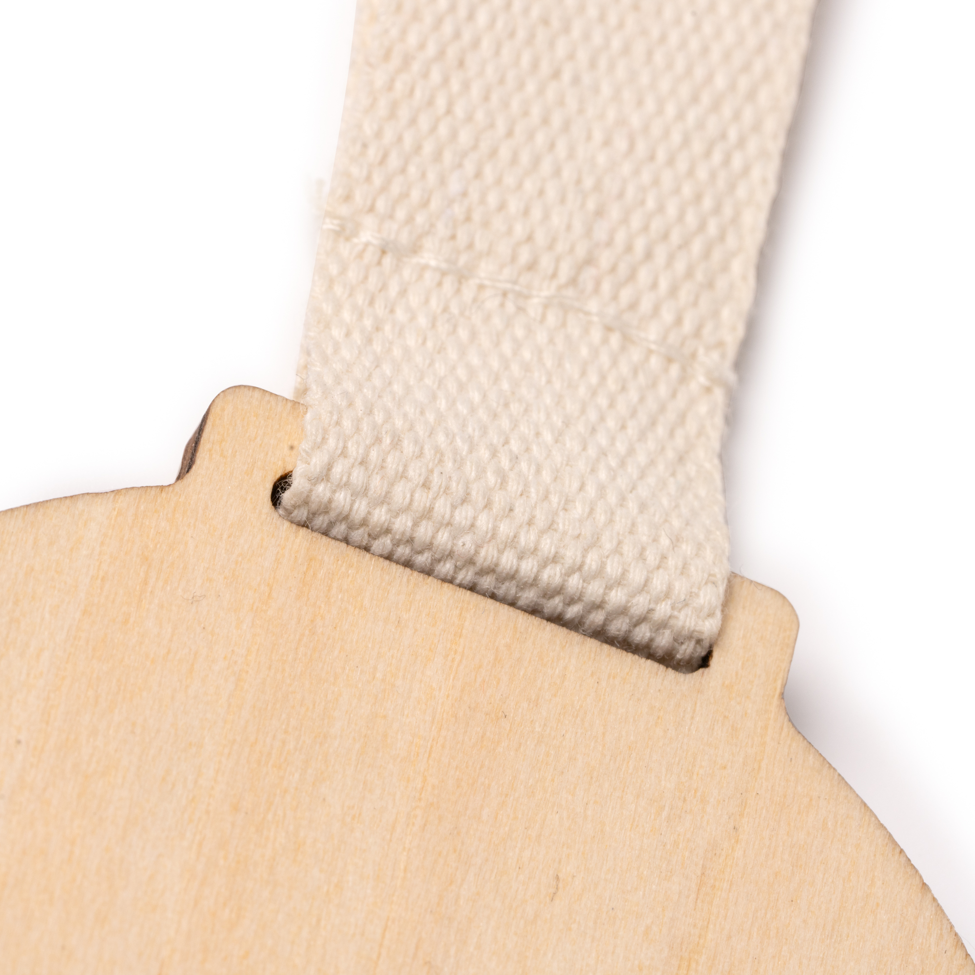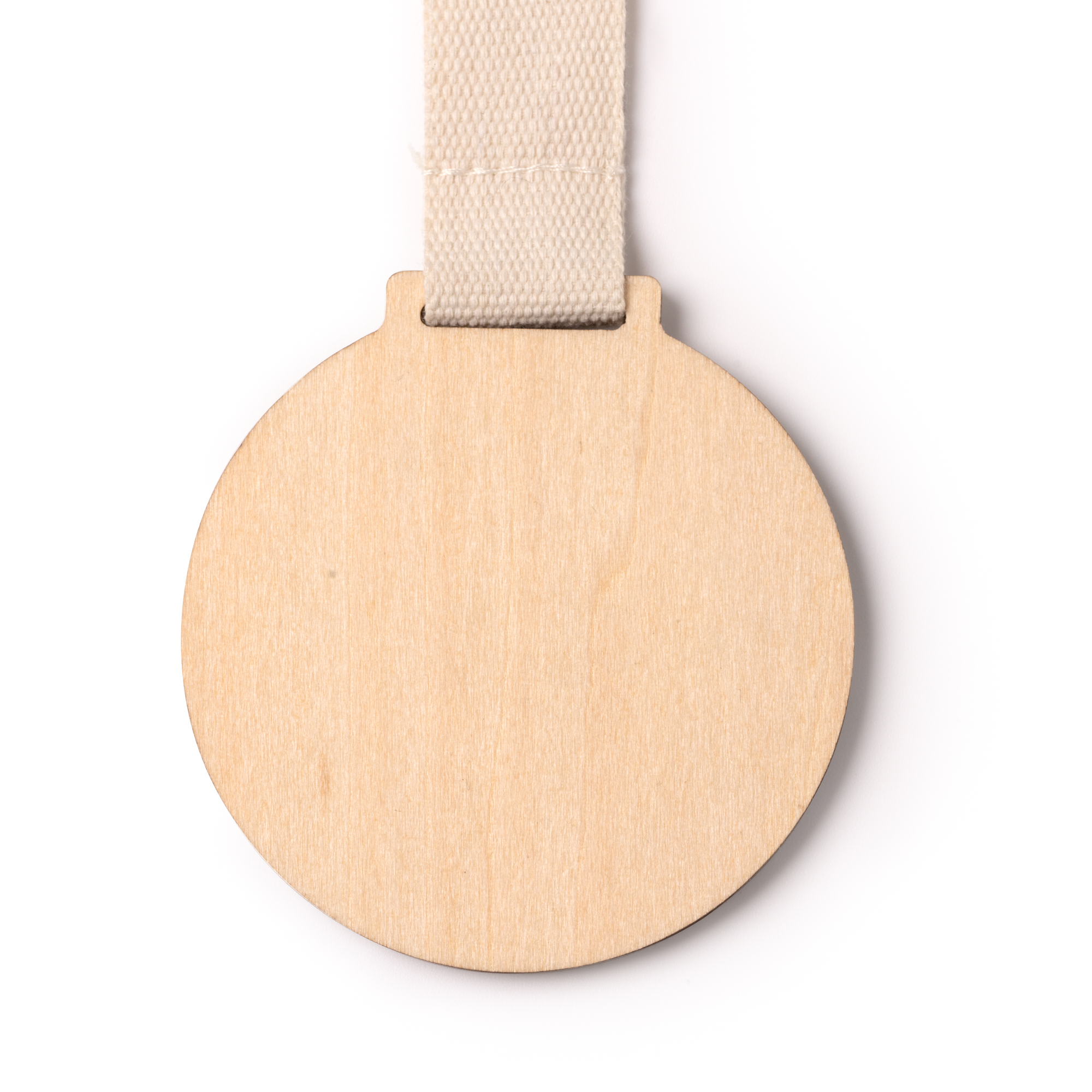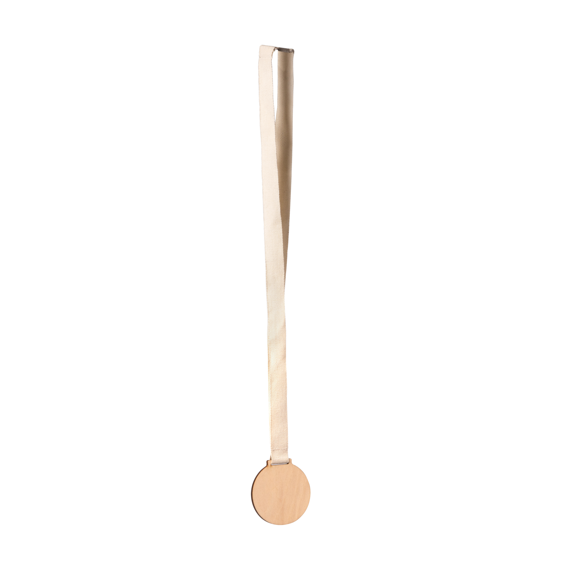 Medalla realizada en bambú con cordón de algodón. Incluye cierre de seguridad elaborado en fibra de trigo en el extremo.