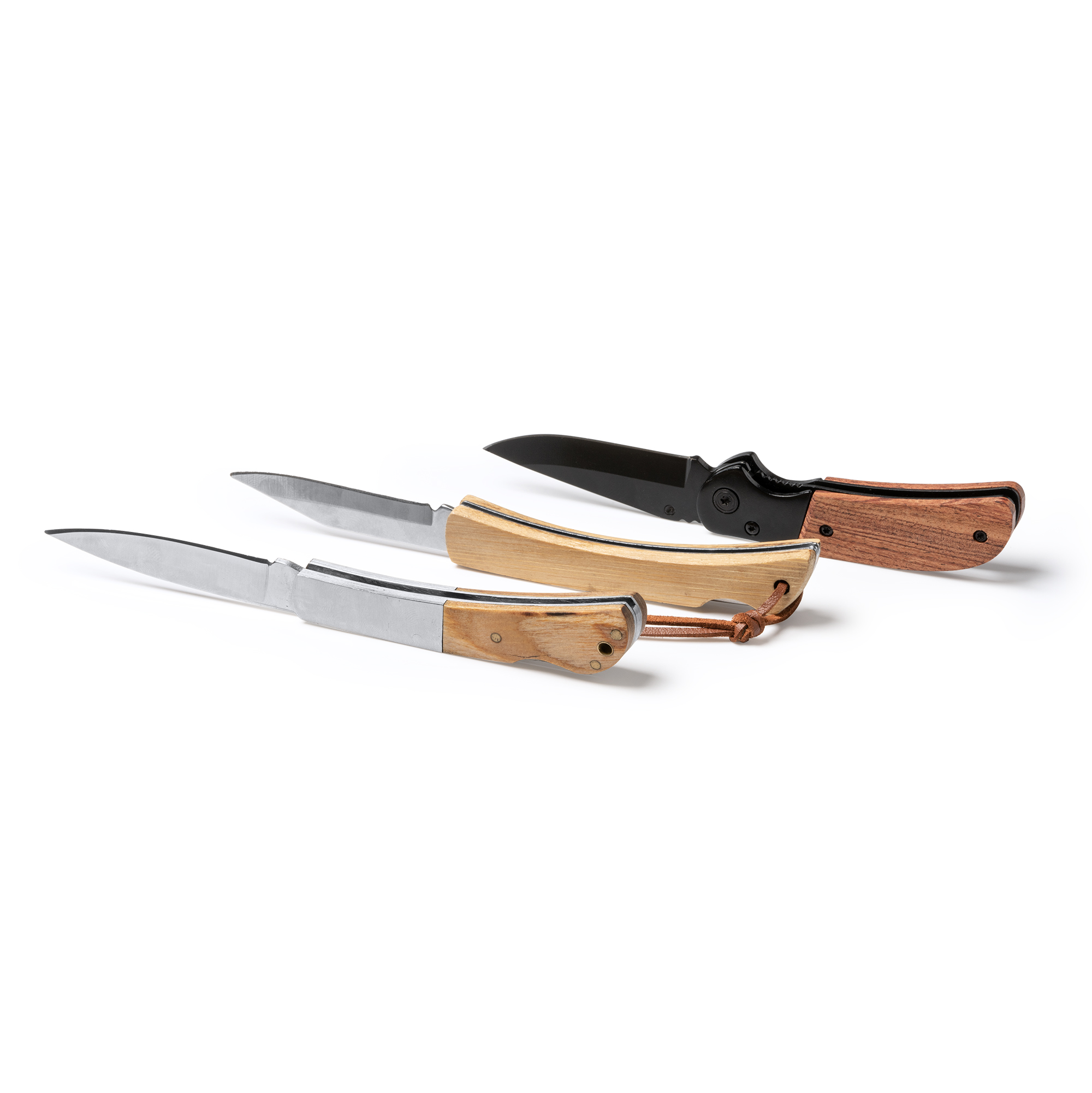 Navaja de acero inoxidable con empuñadura de bambú natural. Incluye cinta para transporte.