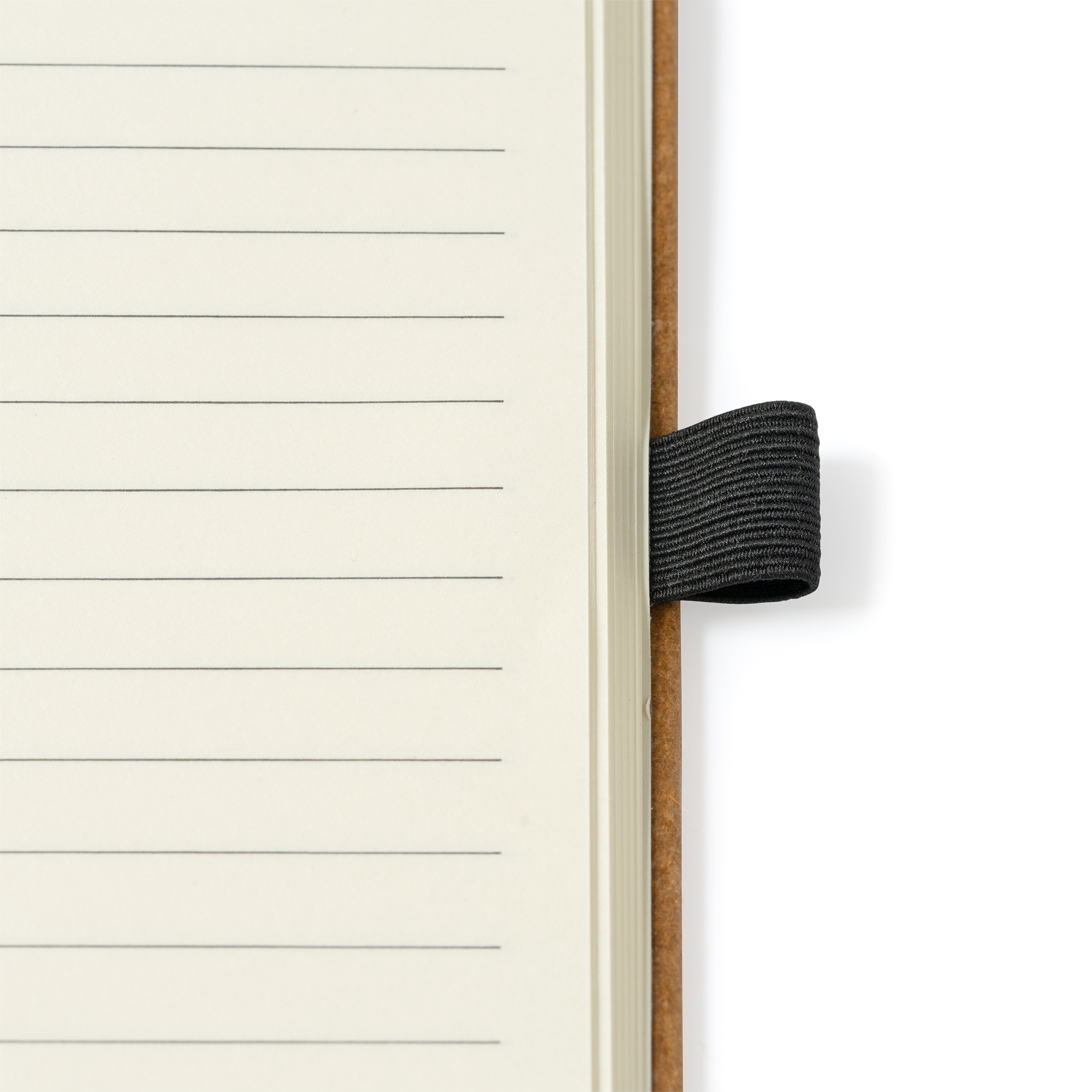 Bloc de notas A5 con tapa rígida elaborada con piel reciclada. Marcapáginas y banda elástica de cierre. Cuenta con 100 hojas a una línea.