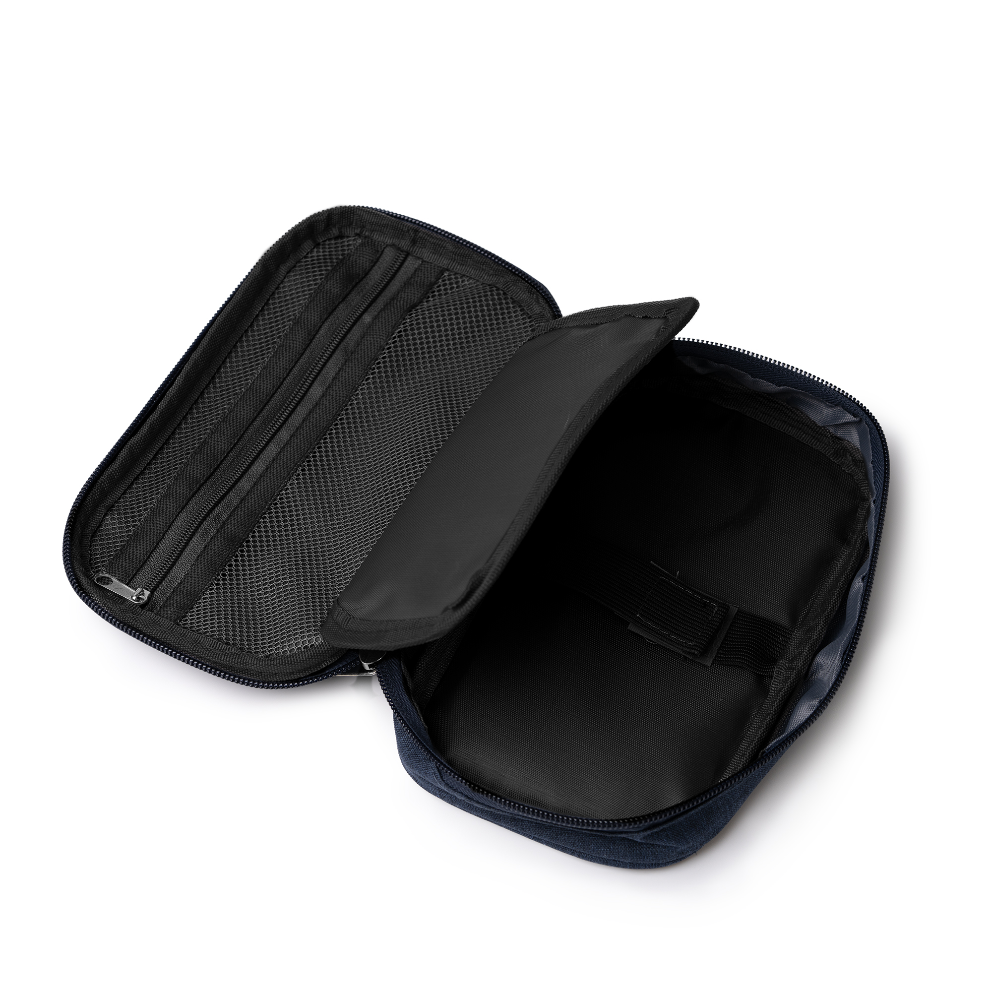 Estuche organizador elaborado en RPET, especialmente ideado para guardar y organizar cables. Cuenta con un compartimento de malla con cierre de cremallera, un compartimento principal con cierre de velcro y un compartimento intermedio para almacenamiento de pequeños objetos. Incluye correa de transporte a conjunto.