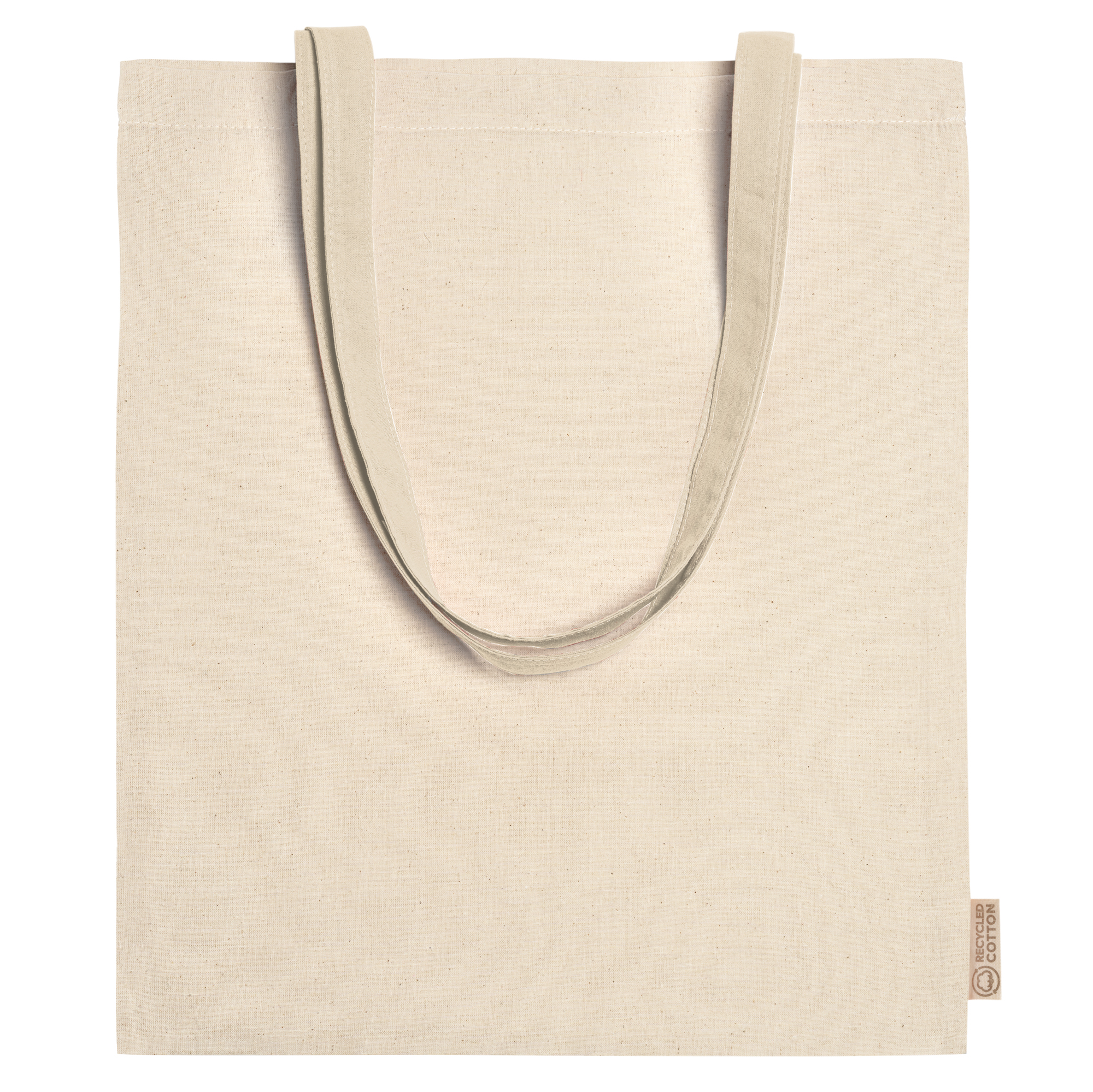 Bolsa elaborada en 70% algodón reciclado y 30% poliéster reciclado de 140 g/m² . Con asas largas de 70cm. Es una opción sostenible y práctica para llevar objetos de diversa índole a cualquier lado.