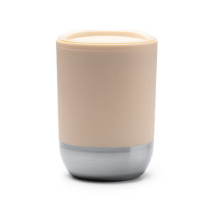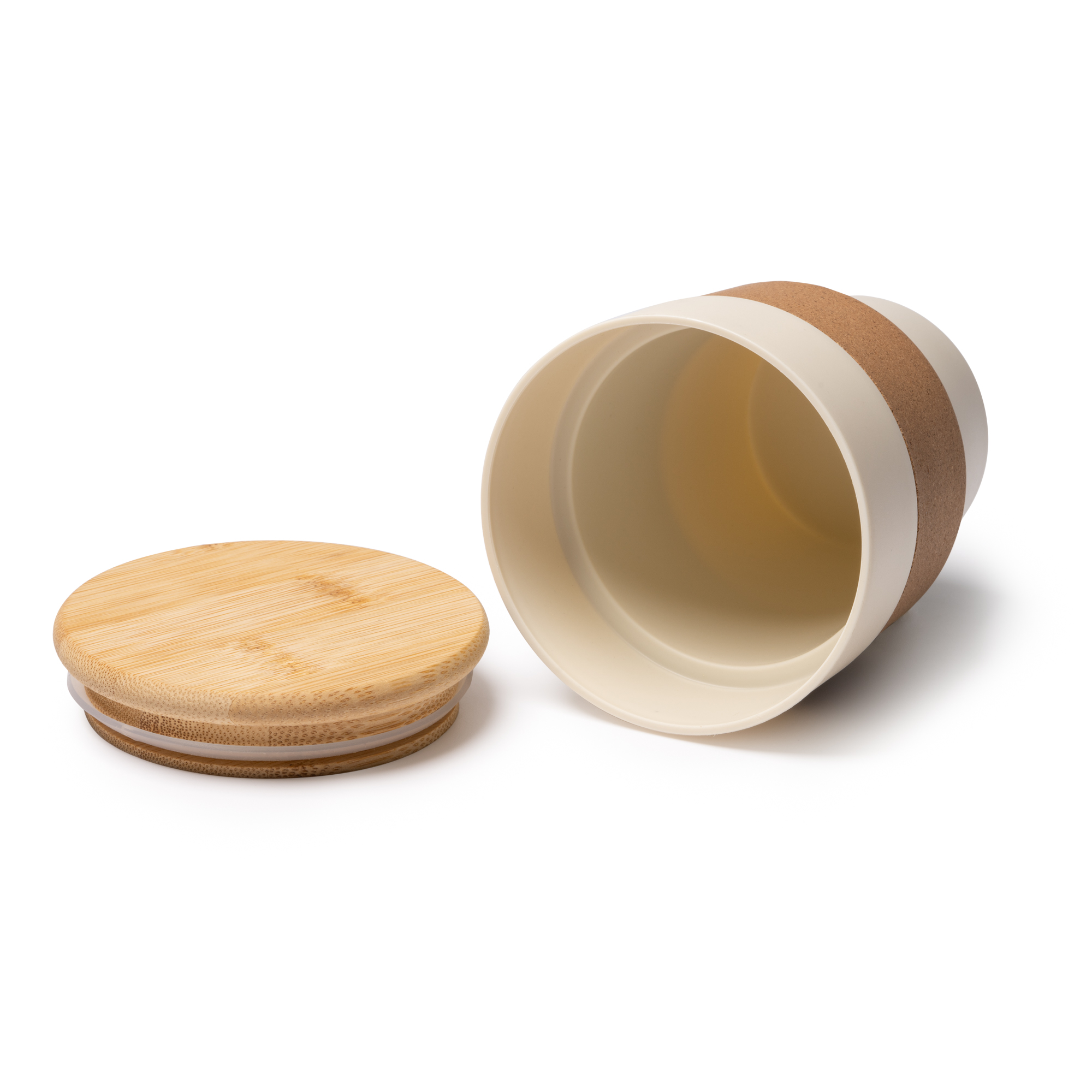 Vaso con cuerpo de PP reciclado, banda de corcho en el centro y tapa fabricada en bambú. Esta tapa cuenta con un anillo de silicona para asegurar su cierre y evitar derrames y caídas de líquidos. Capacidad 350 ml.