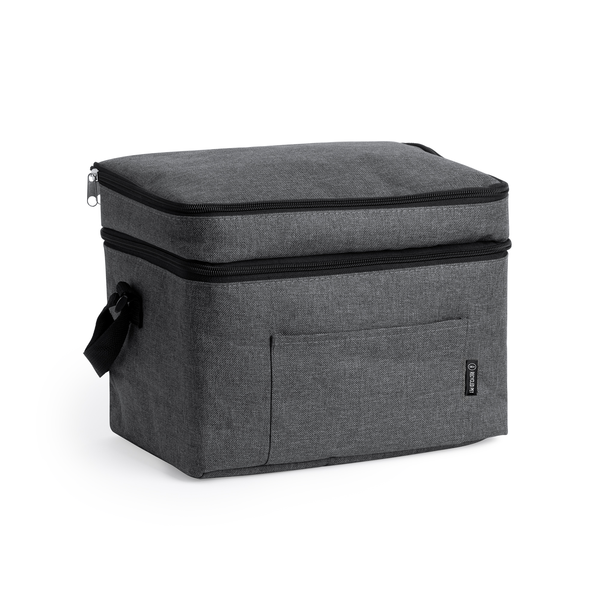 Nevera XL de poliéster reciclado RPET con diseño vigoré. Doble compartimento y bolsillo frontal para el almacenamiento de utensilios y alimentos más pequeños. Interior isométrico. Más capacidad, junto a su cinta ajustable, para llevar la comida y bebida de manera más cómoda.