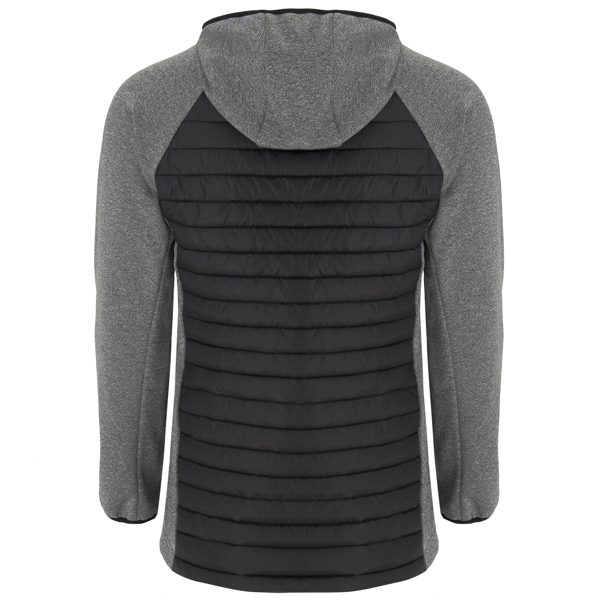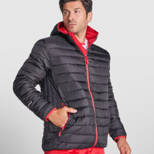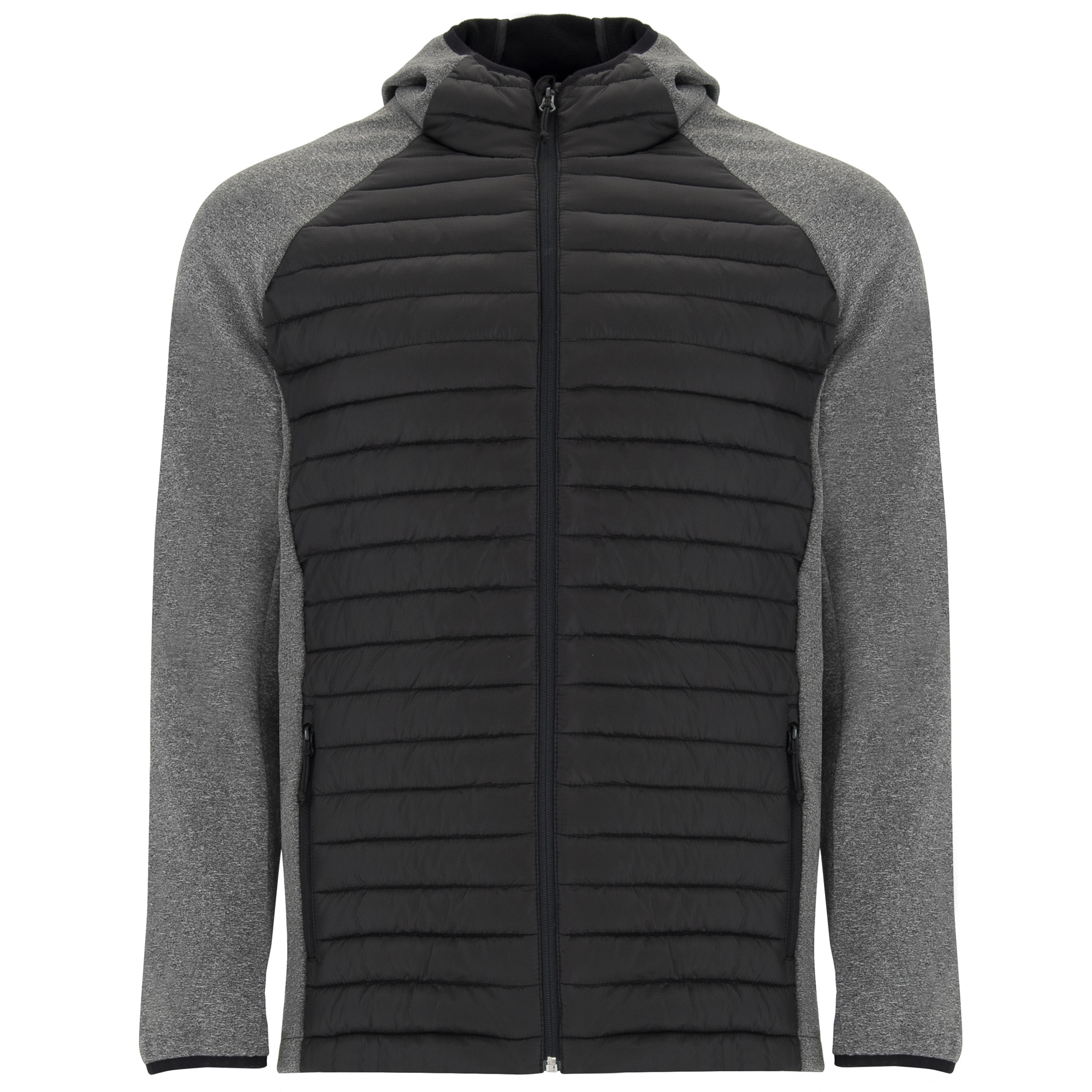 Chaqueta de manga ranglan y capucha combinada con dos tejidos: el cuerpo delantero y espalda en tafetán ligeramente acolchado, y las mangas, capucha y paneles laterales en poliéster con el interior en micropolar. Bolsillos laterales con cremalleras al tono insertados en los paneles laterales. Vivo elástico en contorno de capucha y puños. Espalda con faldón.