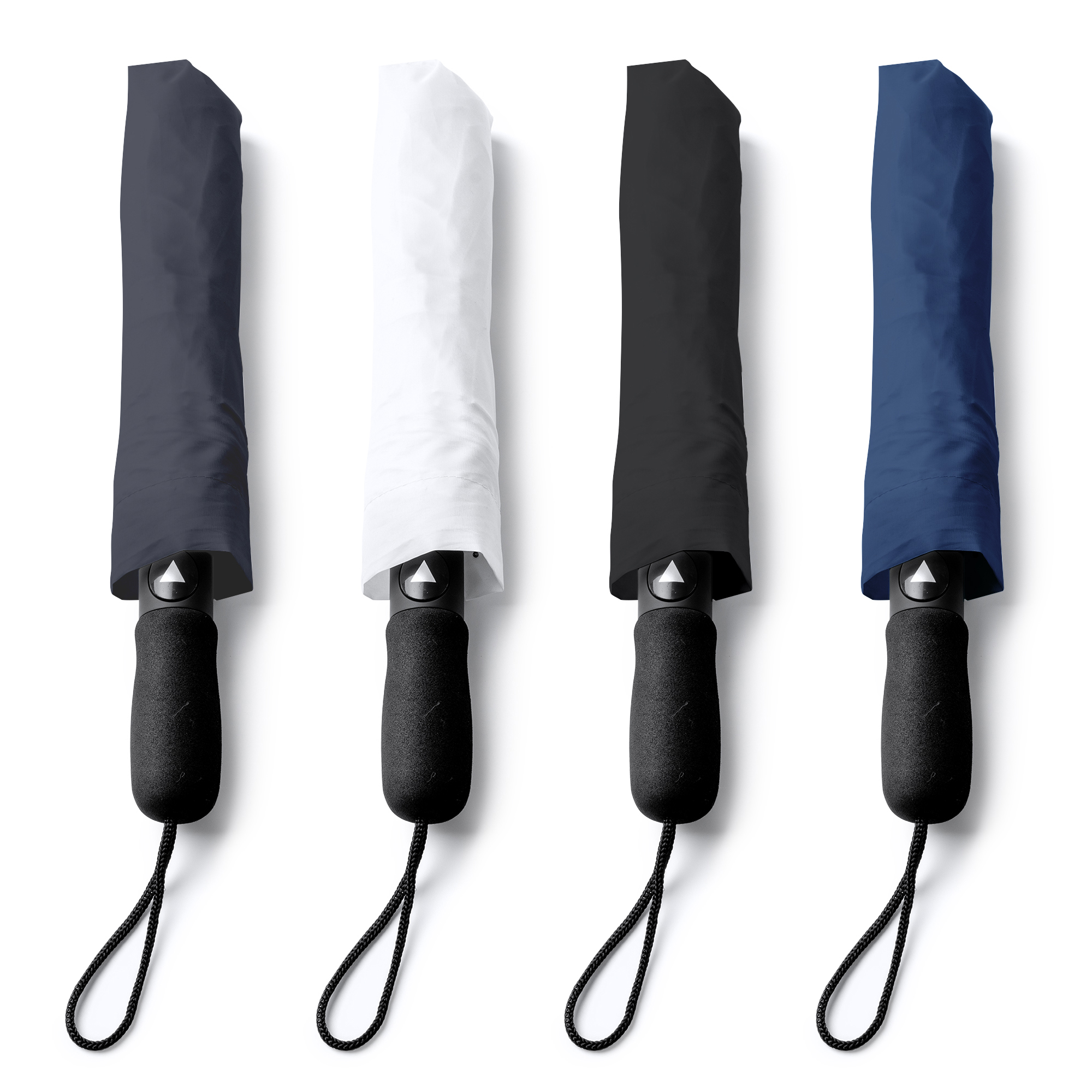Paraguas plegable antiventiscas de apertura automática. Tejido pongee 190T con funda a juego. Mango de EVA y varillas metálicas en negro. El sistema antiventisca le aporta mayor resistencia para los días con viento.