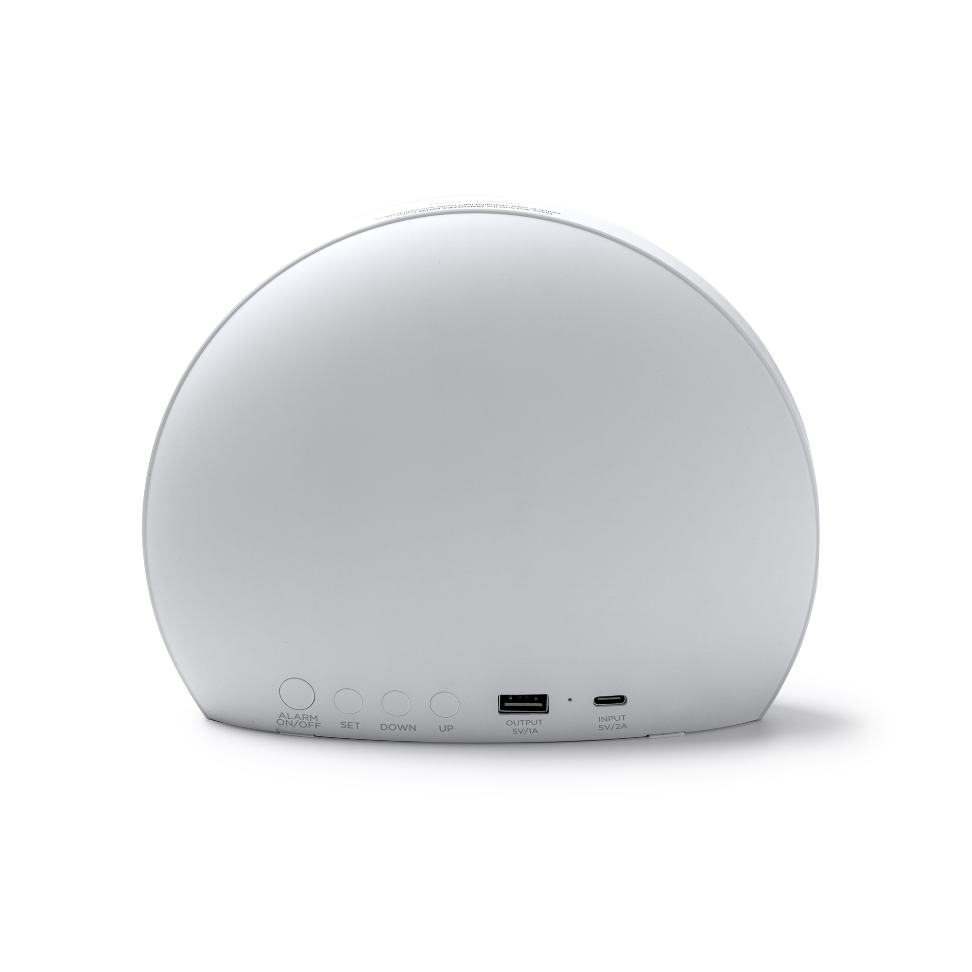 Lámpara despertador realizada en ABS reciclado con luz progresiva. Función de hora, fecha, alarma y temperatura. Función de despertador con encendido de luz.