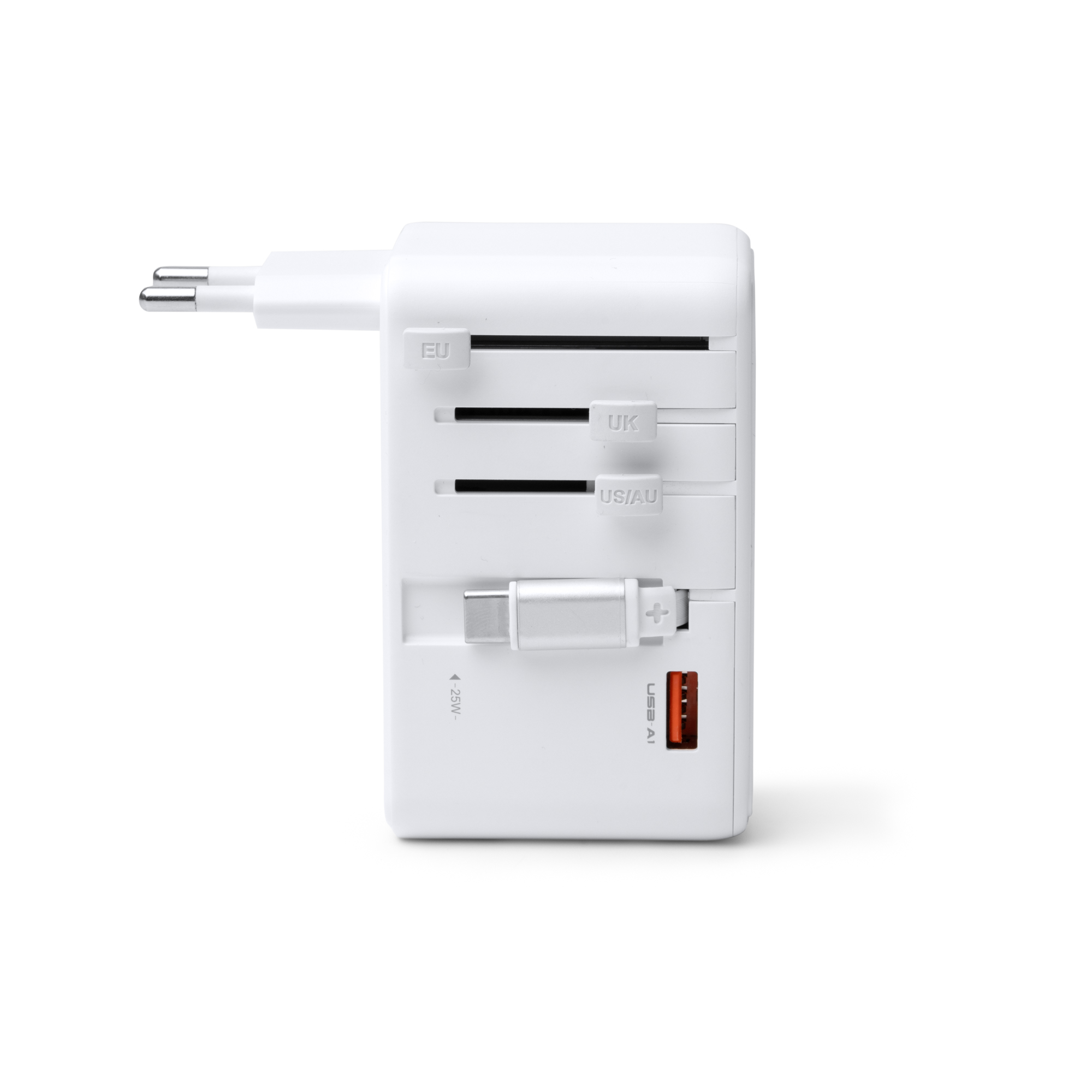 Adaptador de enchufes para viajes elaborado en policarbonato de alta calidad. Cuenta con una potencia máxima de 25W para carga rápida con cables aptos para ello, una salida USB y tres salidas Tipo C. Válido para usarse en Europa, Reino Unido, Estados Unidos, Asia y Australia. Además cuenta con cable de conexión Tipo C retráctil.