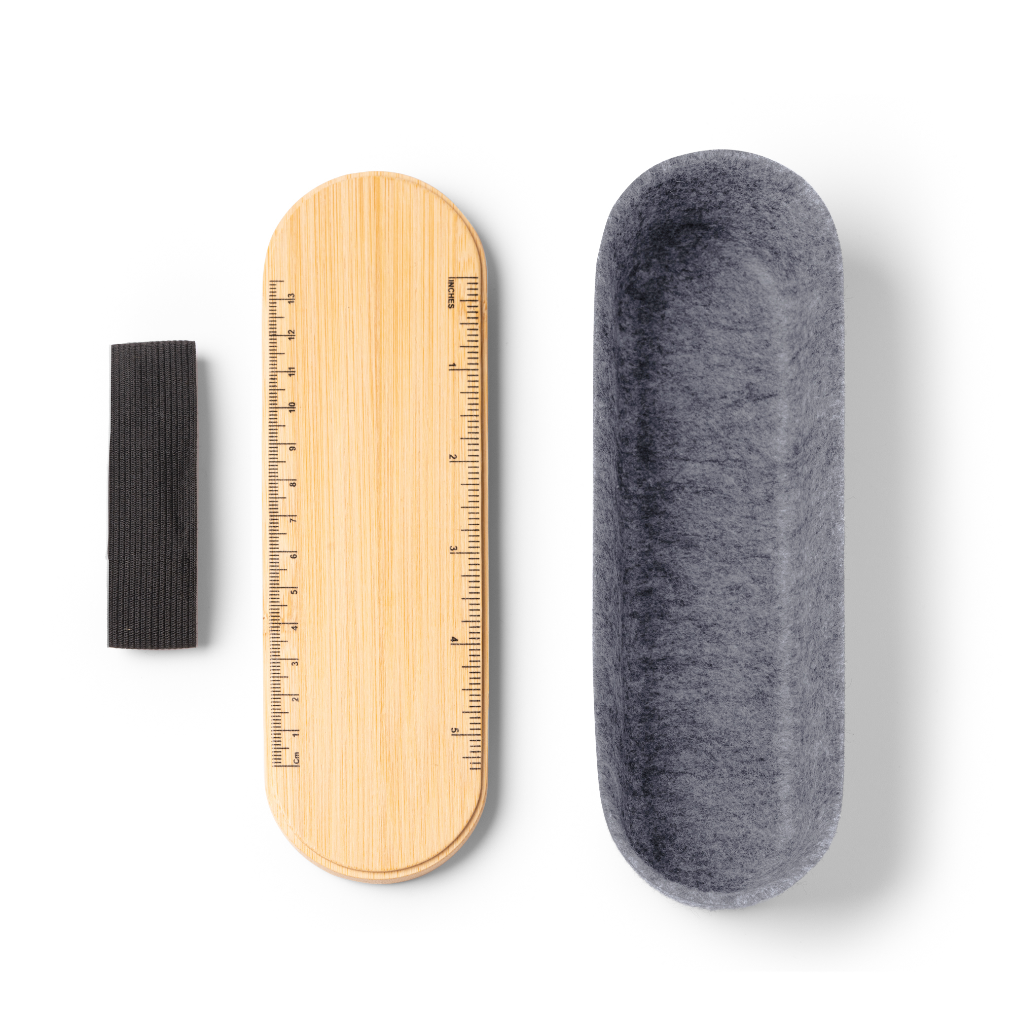 Estuche con tapa de bambú y cuerpo realizado en fieltro reciclado. Tapa con función de regla y soporte para smartphone.