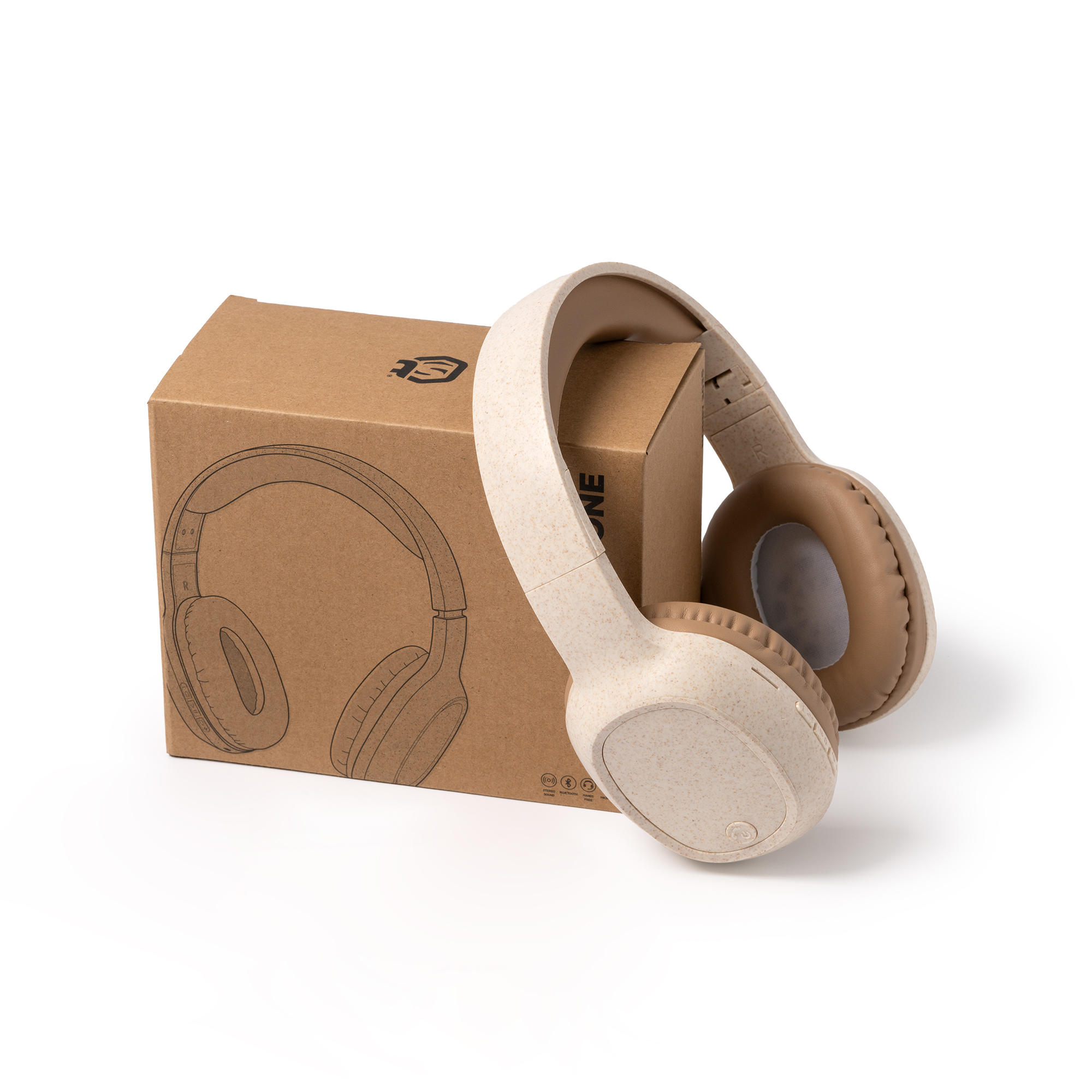 Auriculares inalámbricos realizados en fibra de trigo con acolchado superior y almohadillas en polipiel. Cuenta con función manos libres, con panel de control y botones multifunción para colgar y responder llamadas y micrófono incorporado.