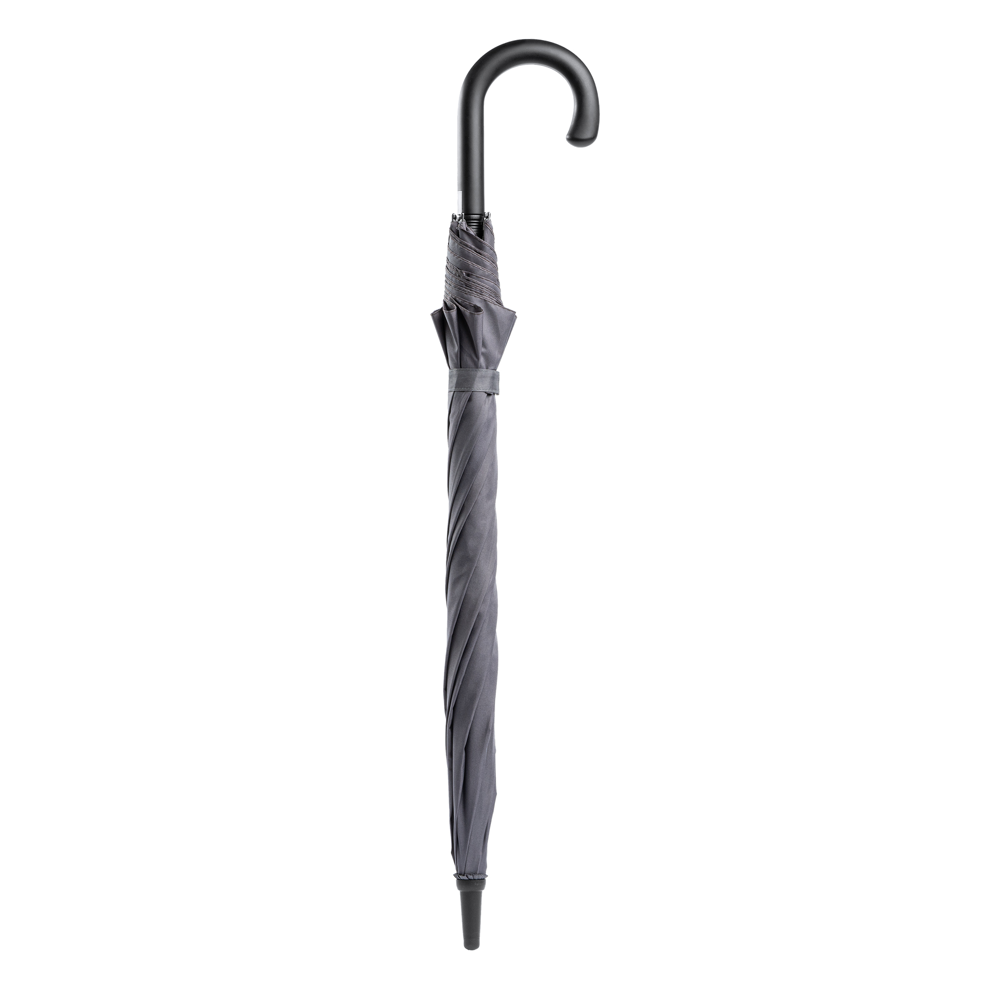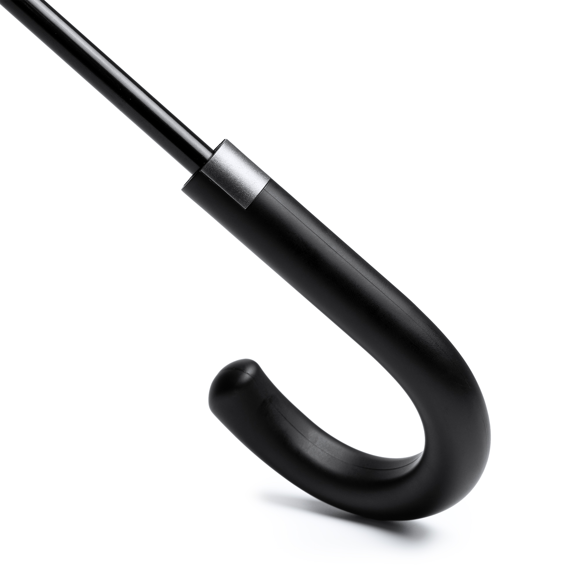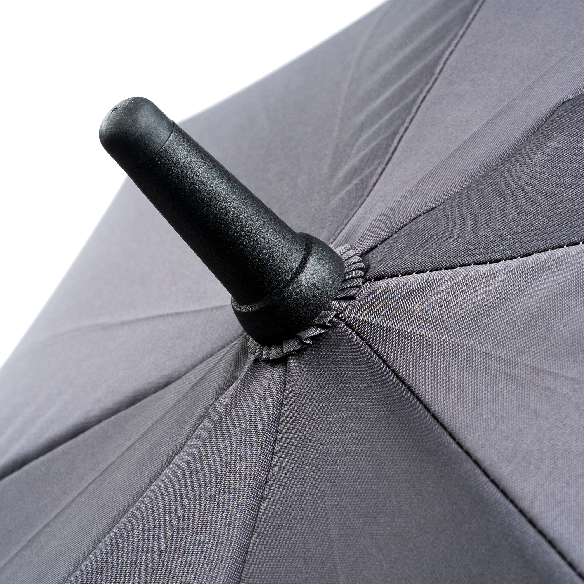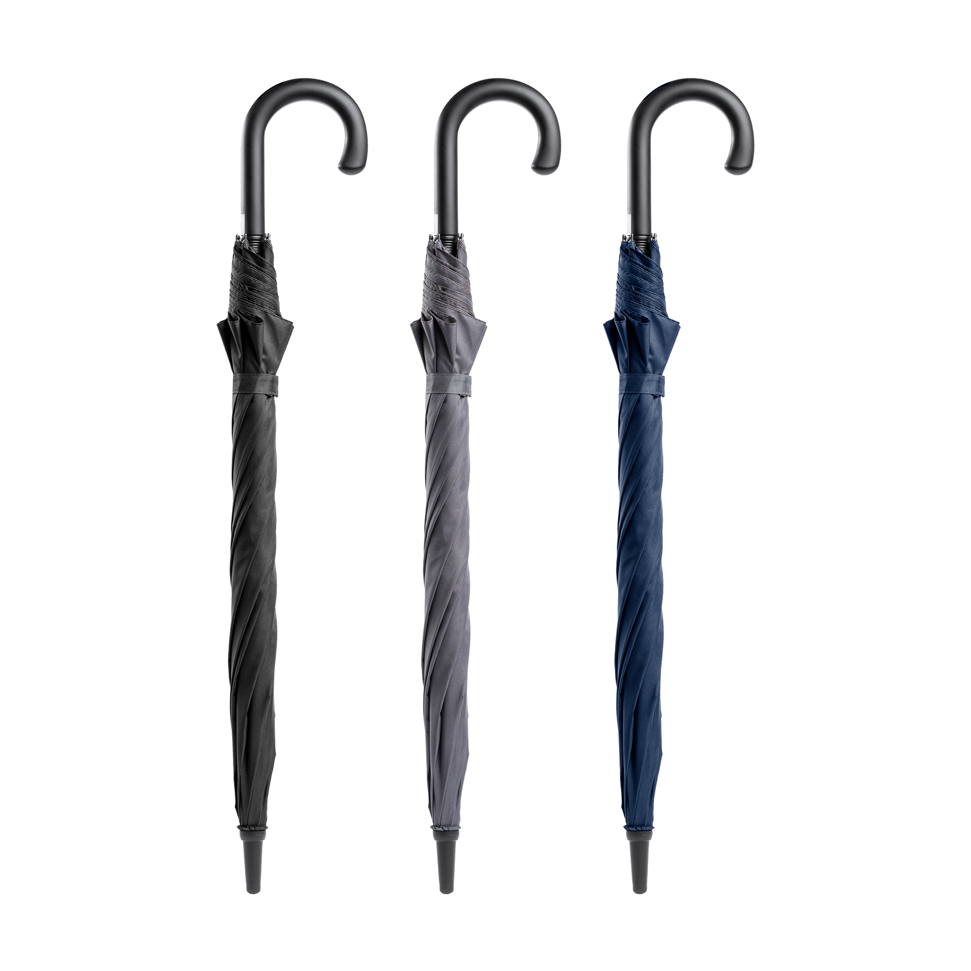 Paraguas realizado en tejido pongee 190T con mango en acabado suave. Apertura automática. Varillas de fibra de vidrio con sistema anti-viento y terminaciones reforzadas.