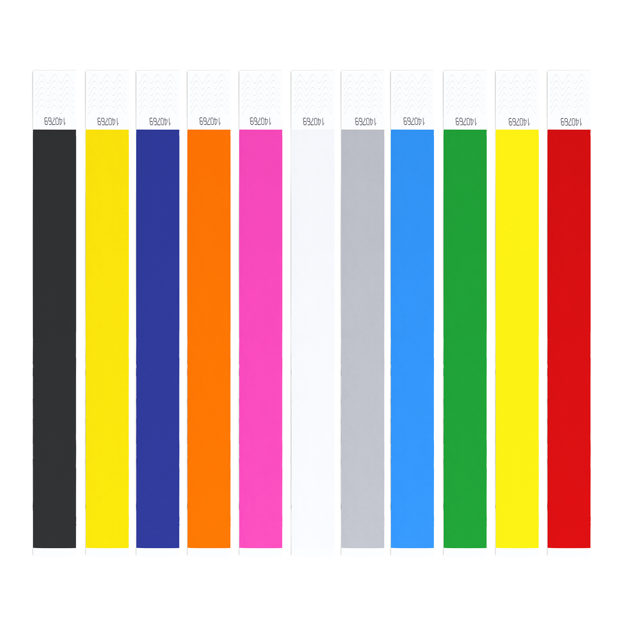 Pulsera para eventos de fibra sintética con numeración individual. Presentada en plancha de 10 unidades.