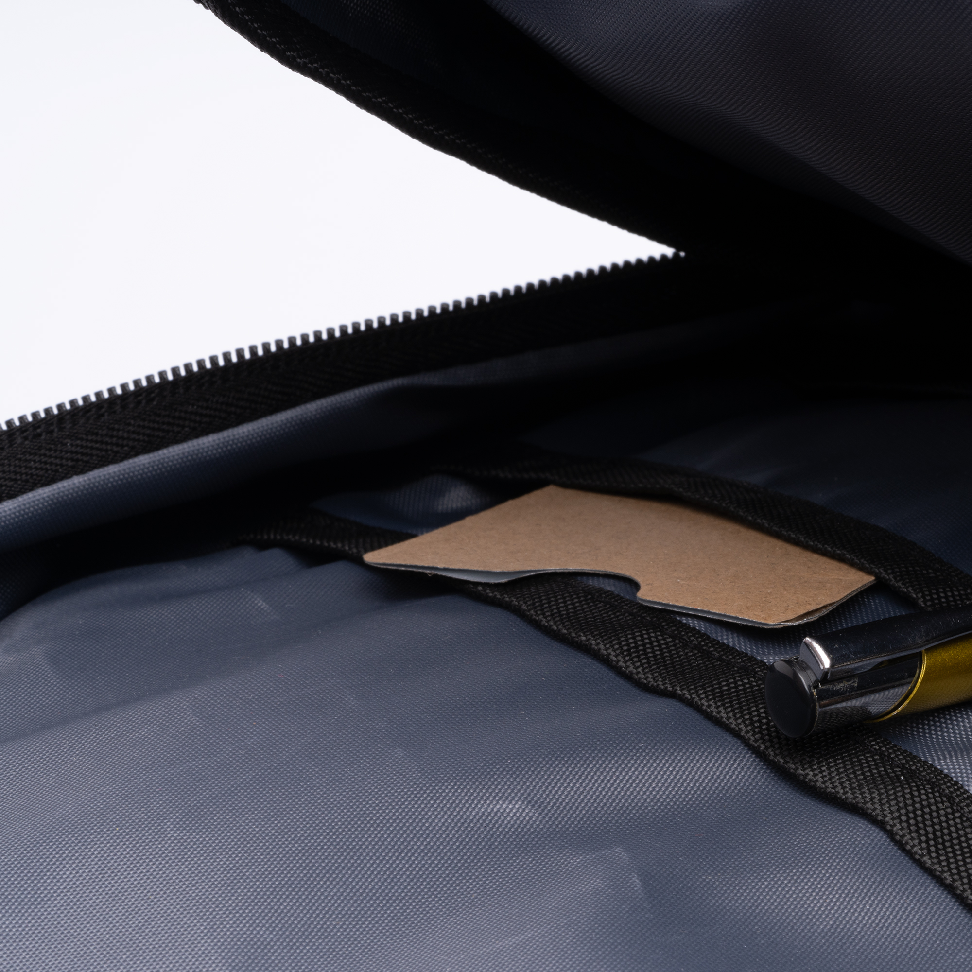 Mochila ejecutiva elaborada en poliéster reciclado RPET 300D con diseño vigoré, confeccionada con materiales reciclados. El cuerpo y el bolsillo interior principal están acolchados optimizados para el transporte y protección de tu portátil de 13″ o Tablet. Además, cuenta con un triple compartimento y bolsillos interiores con sujeción elástica de pequeño almacenamiento. También cuenta con asas y la espalda acolchadas para mayor confort, cinta para trolley para mayor versatilidad en el transporte y compartimentos laterales para almacenamiento de botellas.