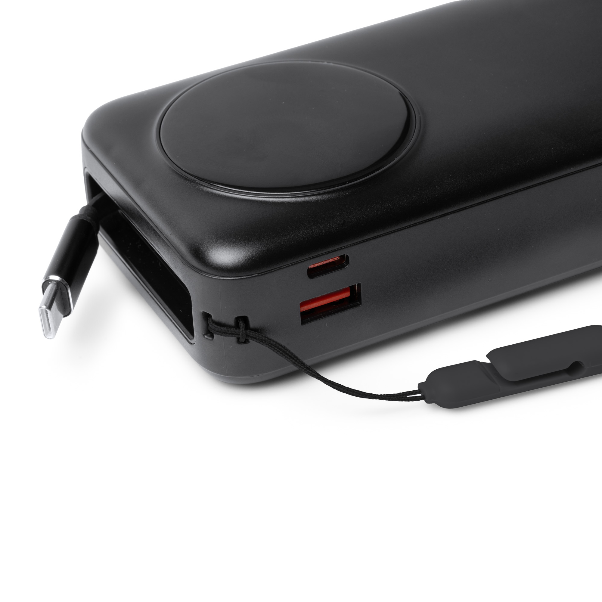 Batería externa elaborada en ABS. Capacidad 20.000 mAh. Potencia 22,5W. Amplia pantalla con indicador de carga. Incorpora cable de salida Tipo C extensible y retractil. Puerto USB salida. Puerto Tipo C entrada y salida. Cinta de transporte incluida. Presentación caja diseño.