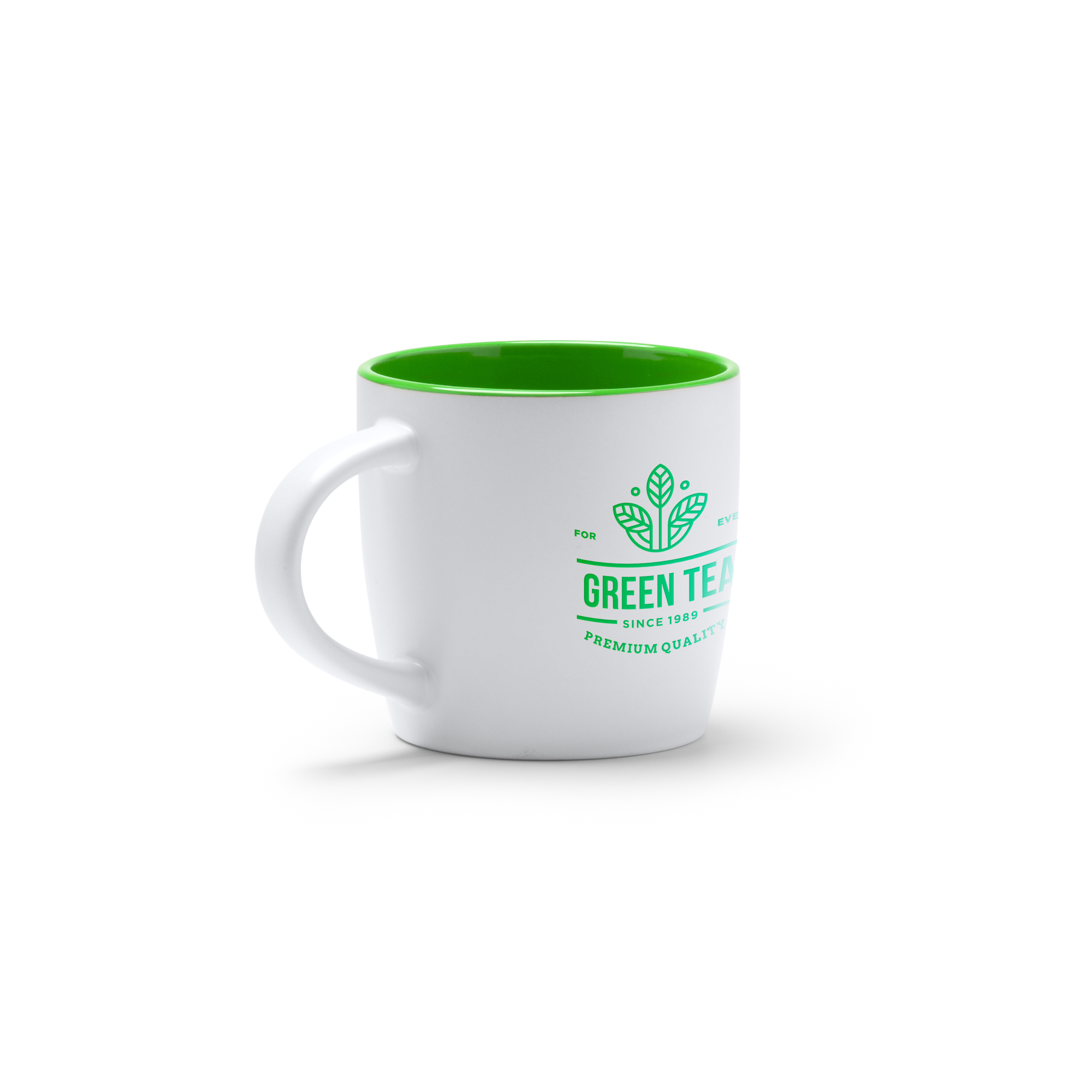 Taza de cerámica de 370 ml. Interior a color y exterior en blanco, con asa redondeada también en blanco, lo que le confiere un aspecto original.