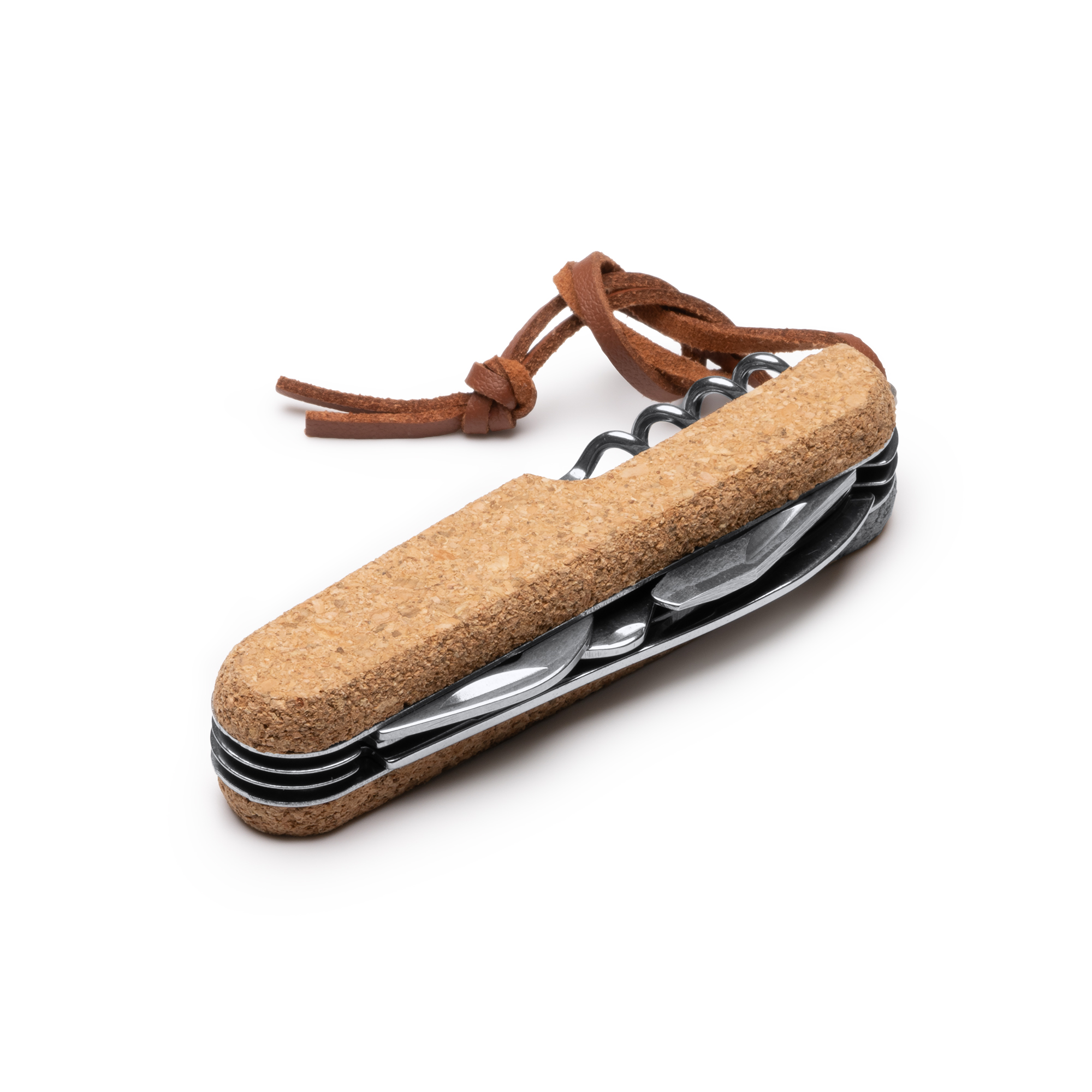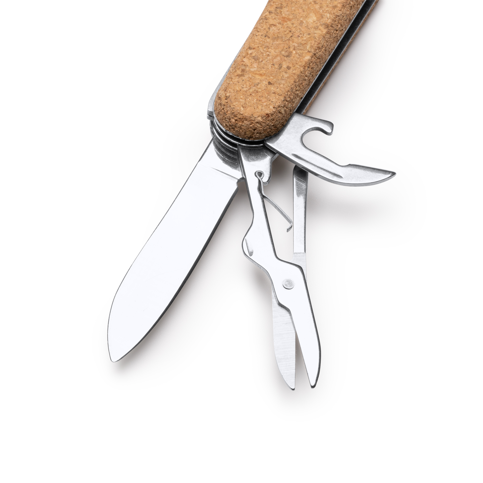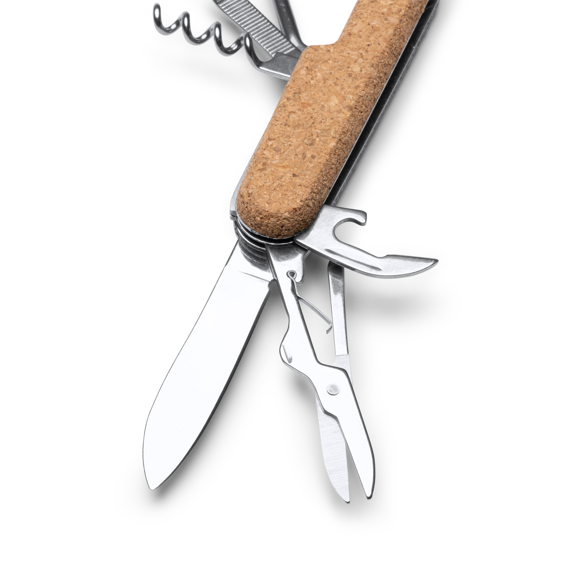 Multiherramienta con accesorios de acero inoxidable y empuñadura de corcho, versátil y práctica con múltiples funciones. Con 9 herramientas diferentes: navaja afilada de acero inoxidable para cortar con precisión, tijeras para trabajos de precisión, un destornillador para apretar o aflojar tornillos, un abrelatas para abrir latas, un sacacorchos para disfrutar de tus bebidas favoritas, y otras funciones adicionales. La empuñadura de corcho le da un aspecto único y agradable al tacto, además de ser una opción sostenible gracias a su composición.