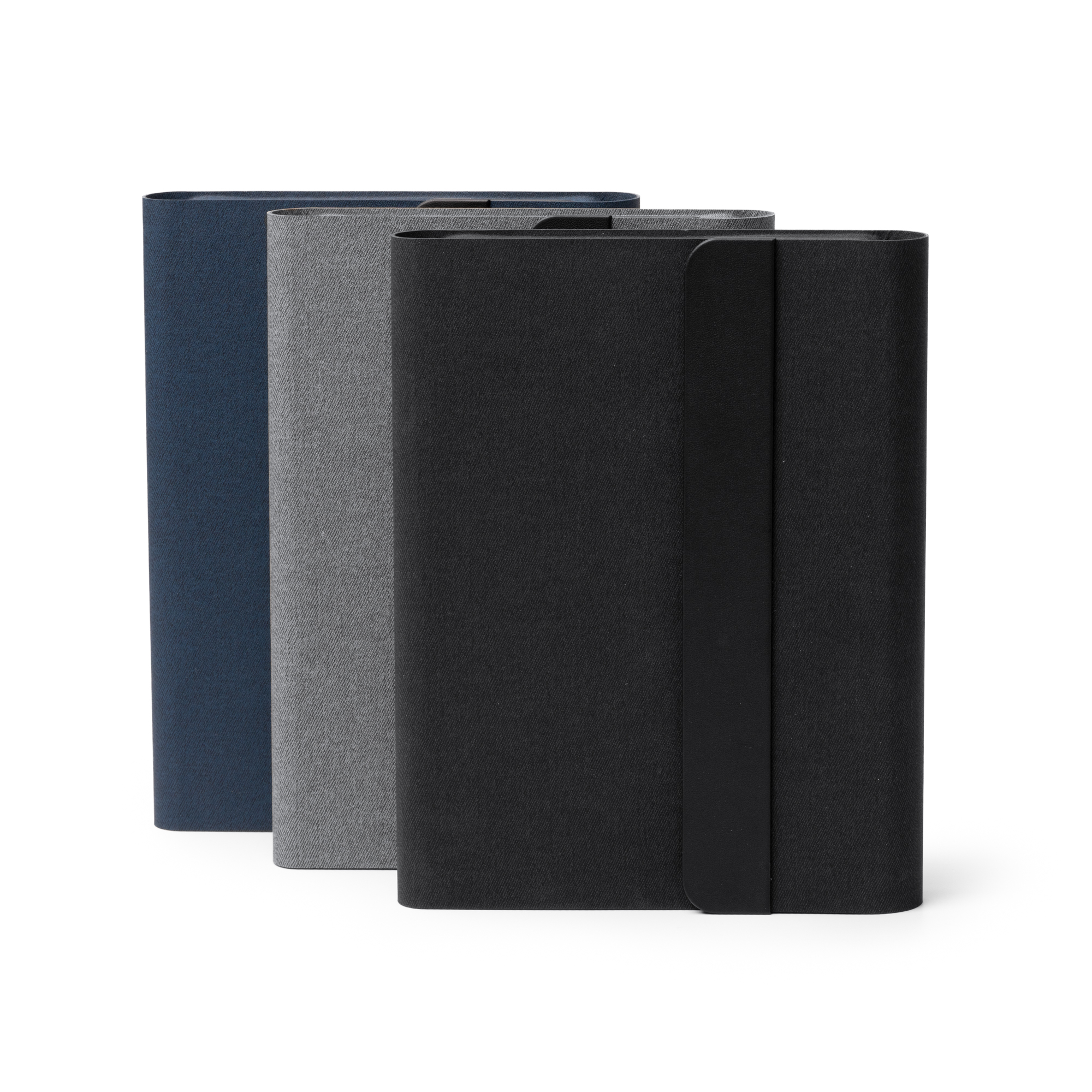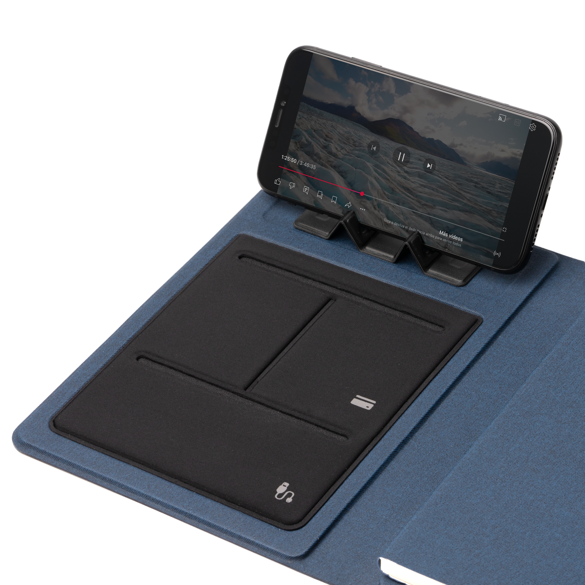 Carpeta multifunción elaborada en RPET con cierre imantado. Incluye carga para smartphone mediante powerbank integrada de 5000 mAh, accionable mediante botón. Incluye tecnología para carga inalámbrica de tu móvil. Cuenta un bloc de 64 hojas en tamaño A5, compartimento para tarjetas y un soporte para smartphone y para bolígrafo.