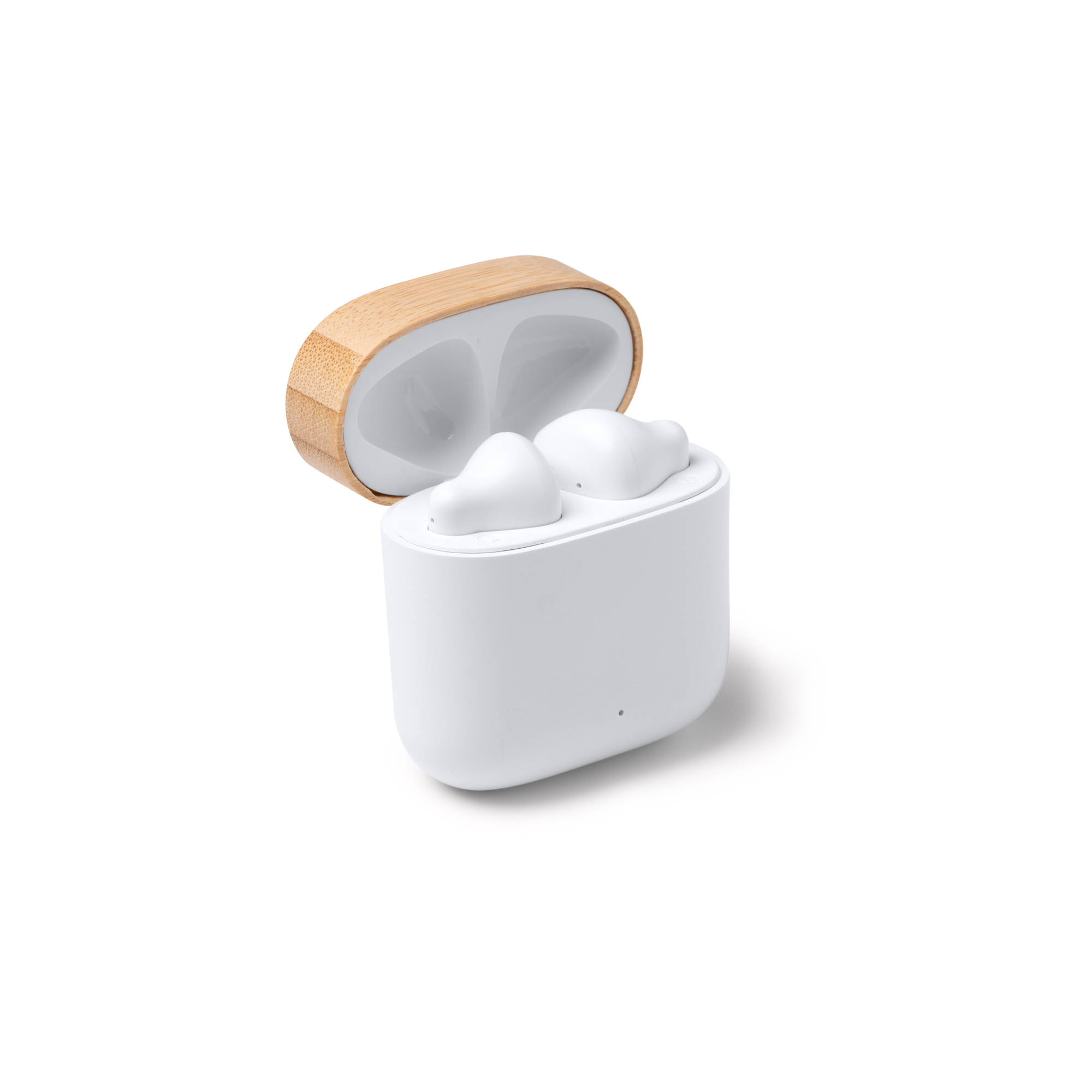 Auriculares inalámbricos presentados en estuche elaborado en material reciclado y detalles en bambú. Función manos libres y asistente de voz mediante botón multifunción táctil de ambos auriculares. Control táctil de reproducción de audio como funciones de control de volumen, pista siguiente.