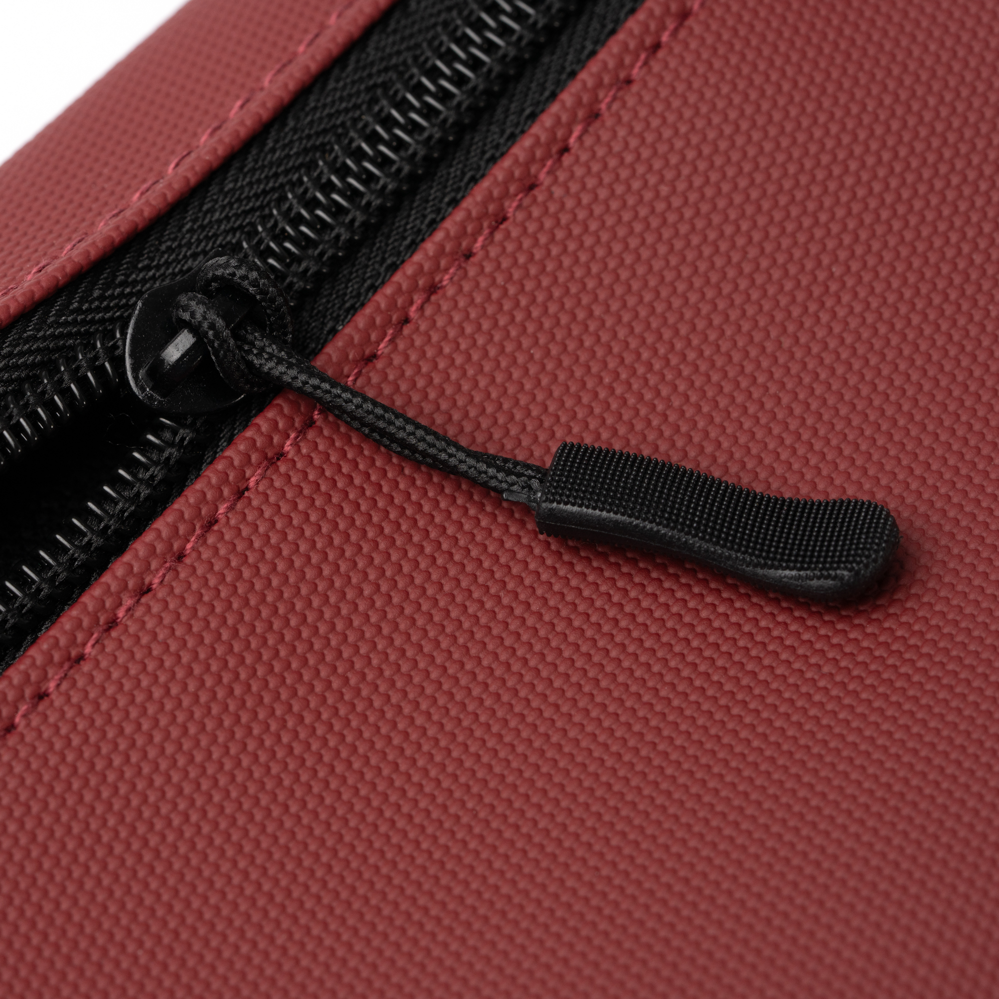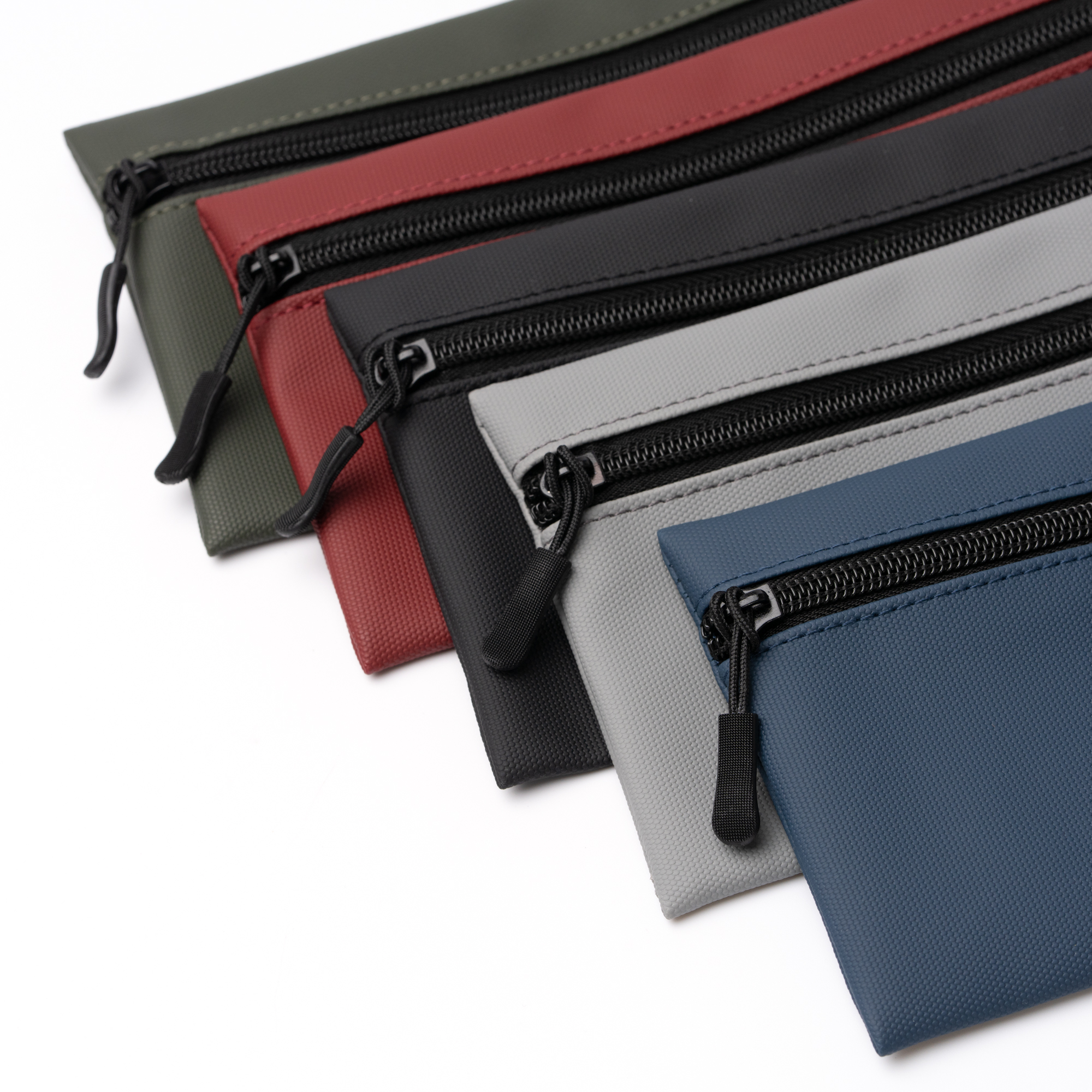 Estuche elaborado en suave PU, con acabado en colores lisos. Cuenta con cremallera y tirador en negro.