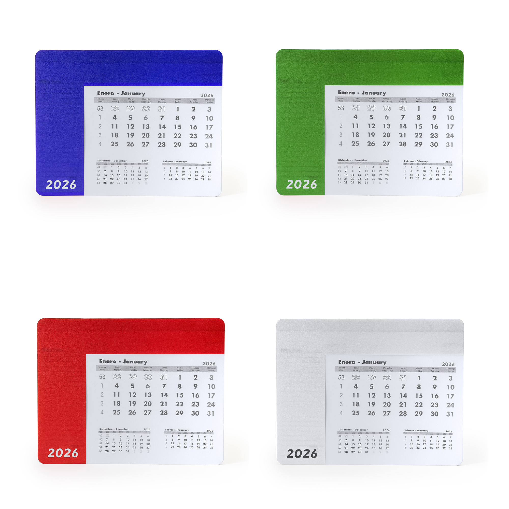 Alfombrilla rectangular para ratón con calendario. Cubierta de un color y transparente, tras la que se puede ver la hoja del mes correspondiente. La cubierta se levanta para acceder al calendario de 12 hojas en español e inglés, cuyas hojas se arrancan. En cada hoja mensual, aparece el mes en curso, el anterior y el posterior. Base antideslizante negra. Gramaje del papel 80 g/m². Grosor de la cubierta 0,3 cm.